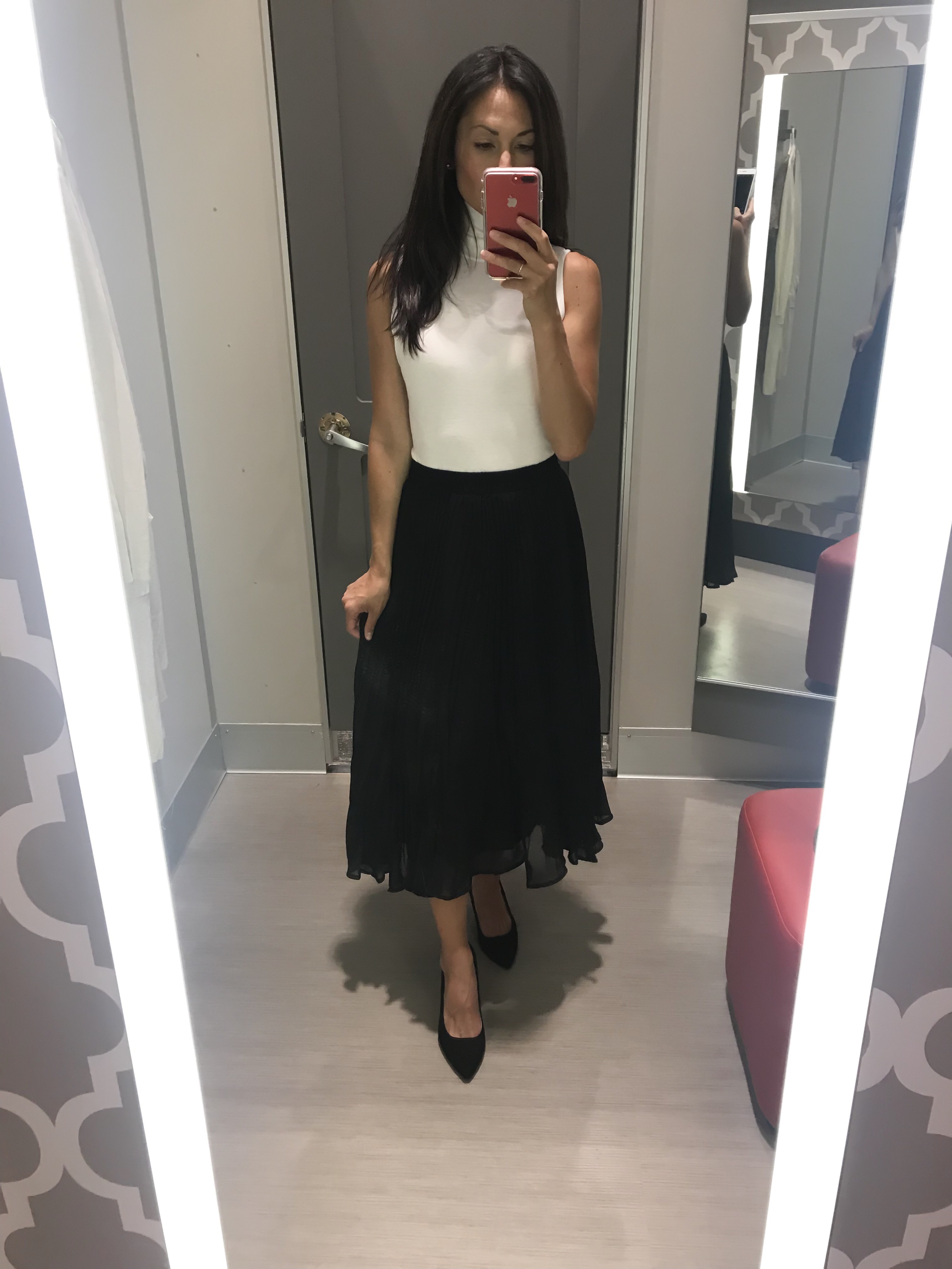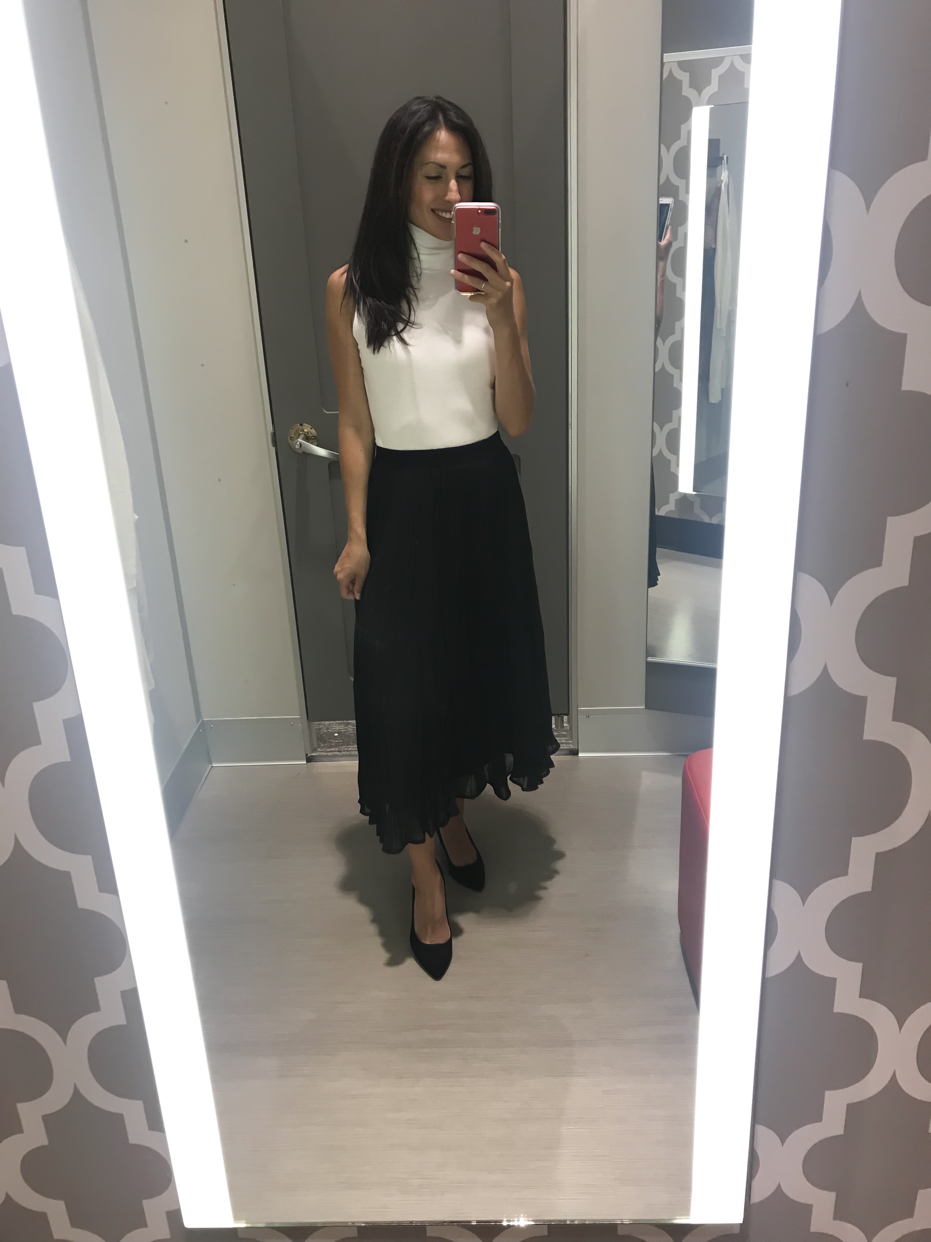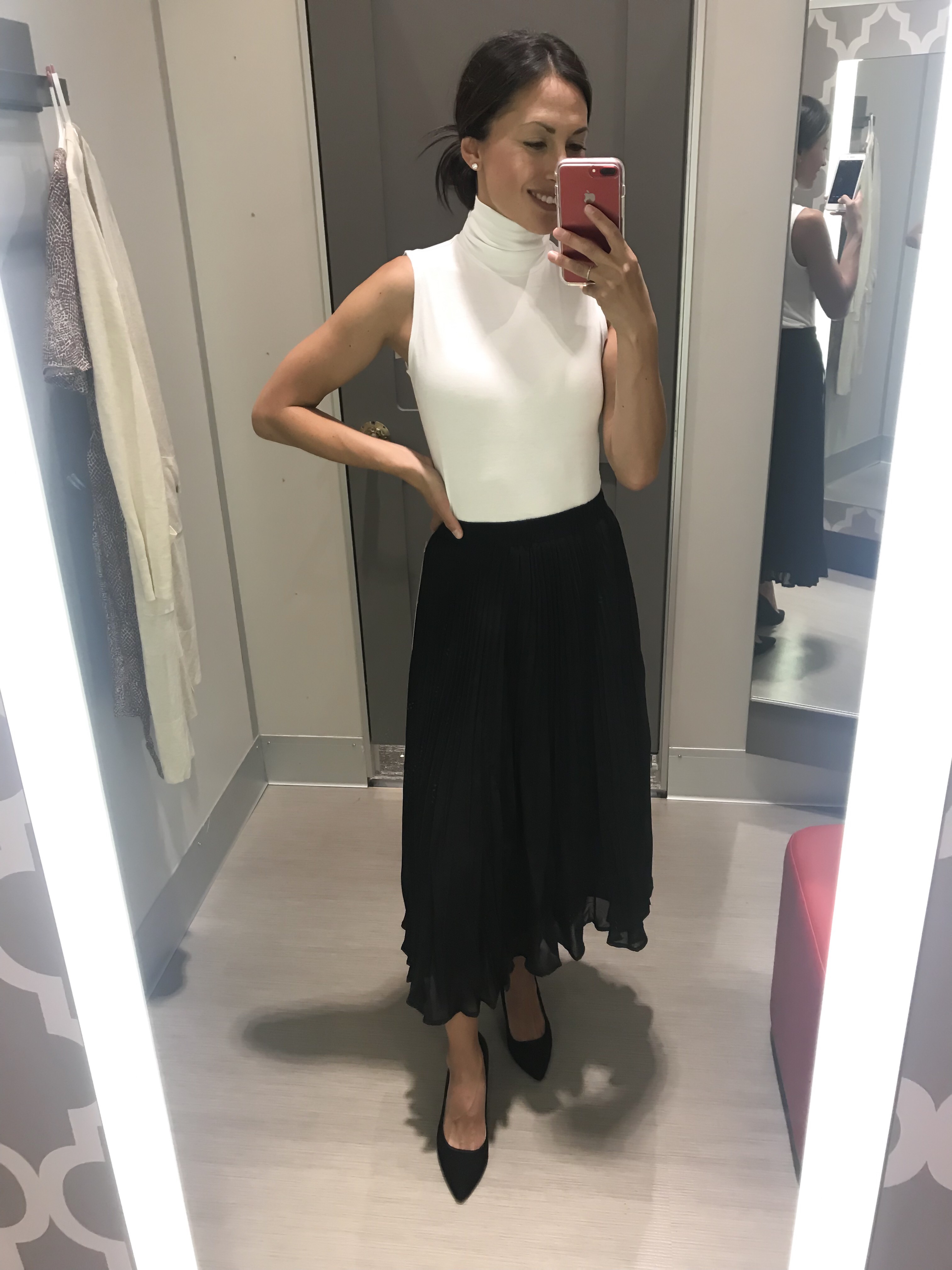 Here’s the same dress in black and once again, styled for the cooler temps as well. So clearly, I love this sleeveless turtleneck. Here it is again in white with the cutest pleated skirt that is only $28.Shop the look: