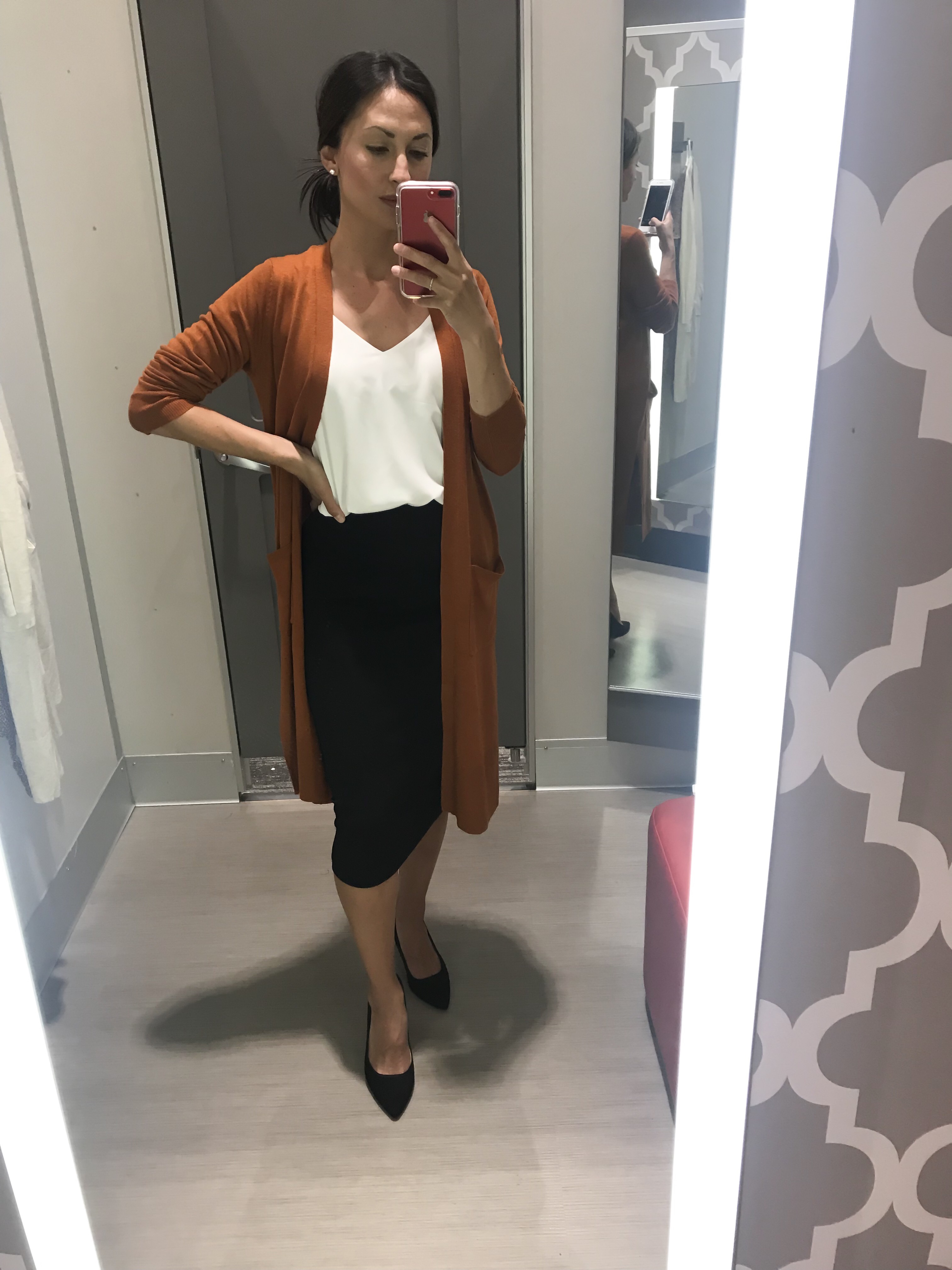 If pleated skirts aren’t your thing, this pencil skirt is a great wardrobe staple! This skirt is only $23. I’ve also styled it with this versatile camisole and blazer for more of a business look and with this rust colored cardigan (always love this color for fall!). This cardigan comes in a bunch of different colors and is also $23. Here is another skirt, which is just a bit shorter in length if that is what you prefer.Shop these looks: