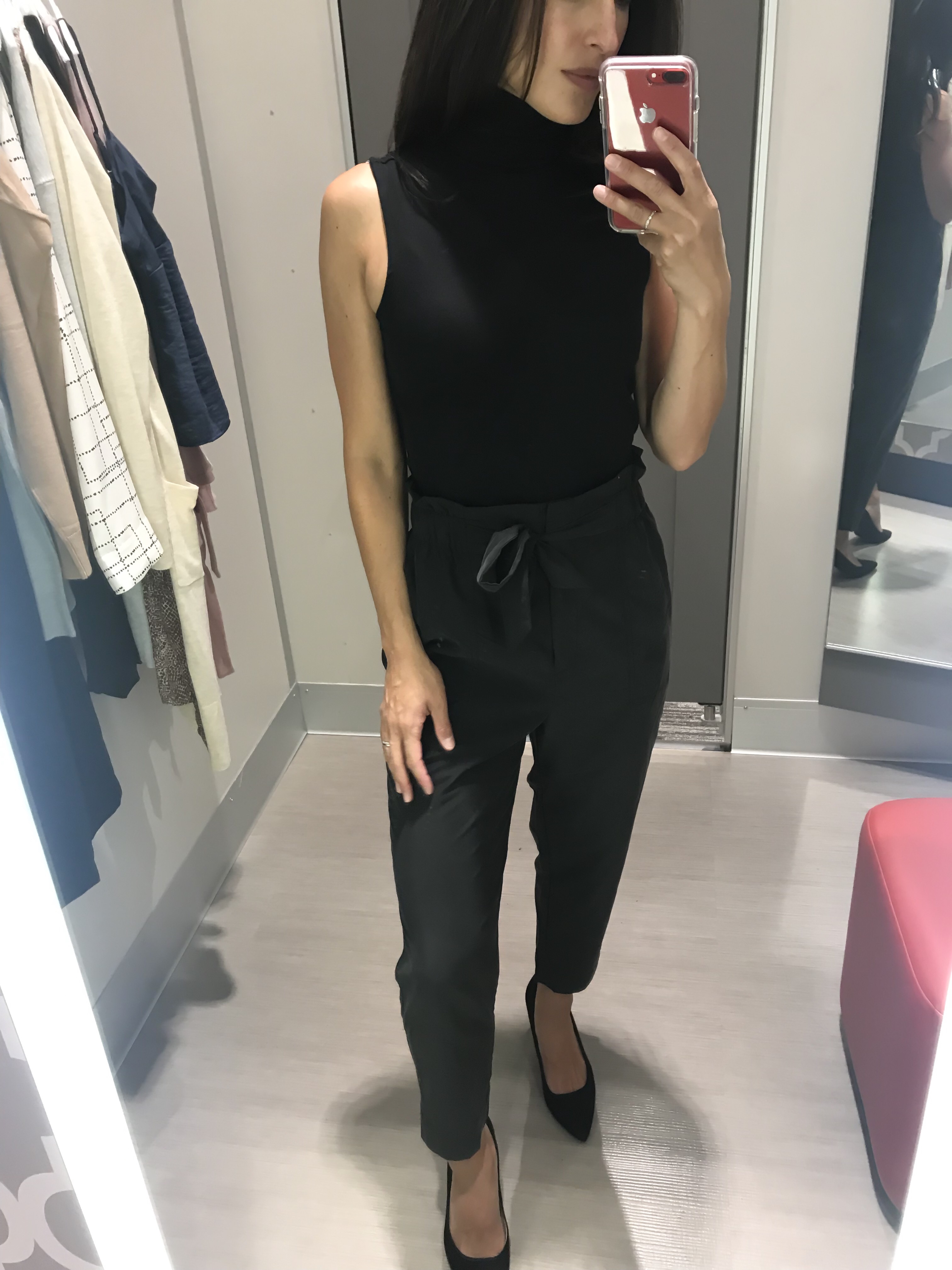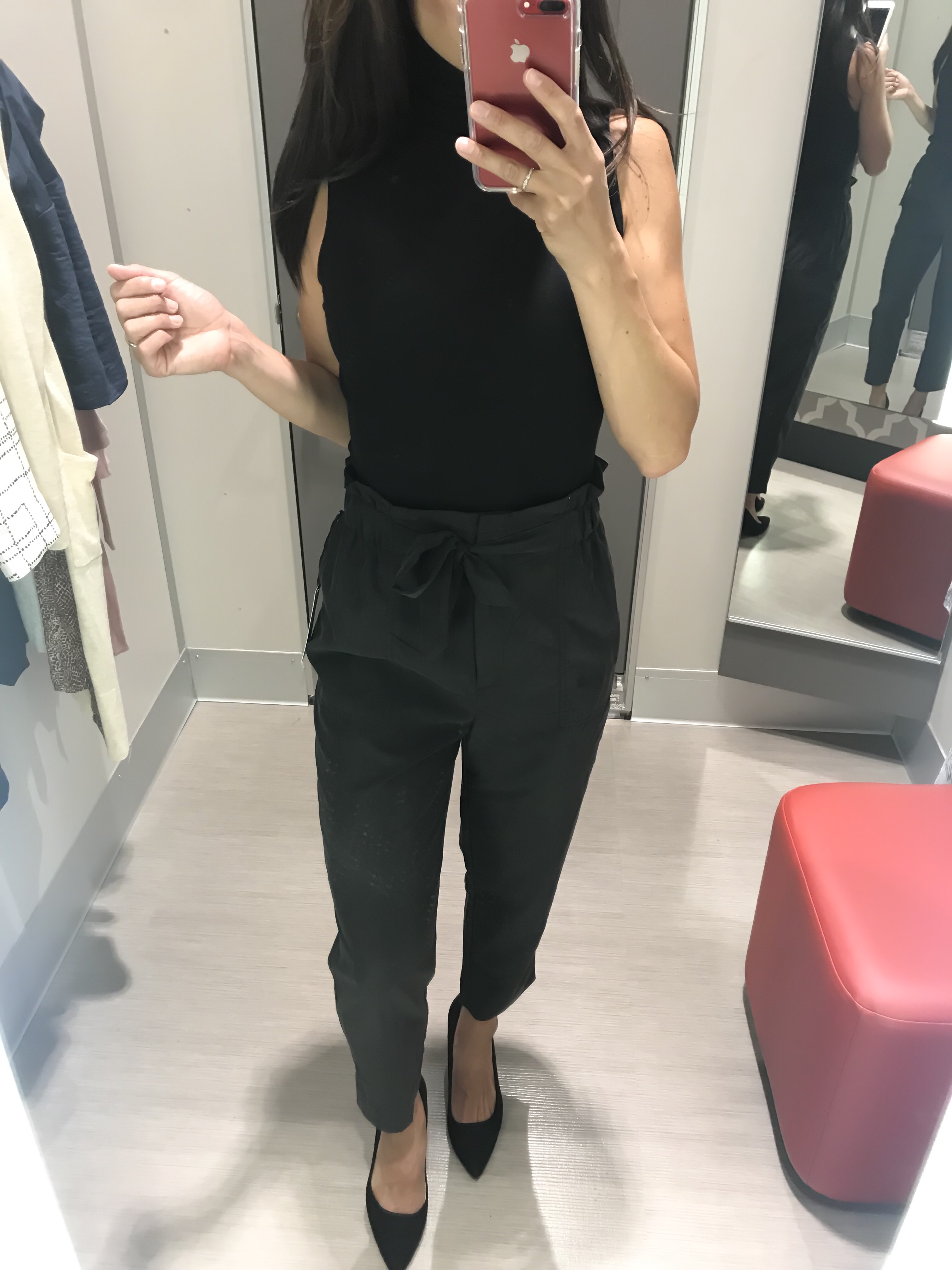 These paperbag ankle pants are a modal blend. They are extremely comfortable and only $28. Although they are labeled as black, I find them to be more of a charcoal gray color.Shop the look: