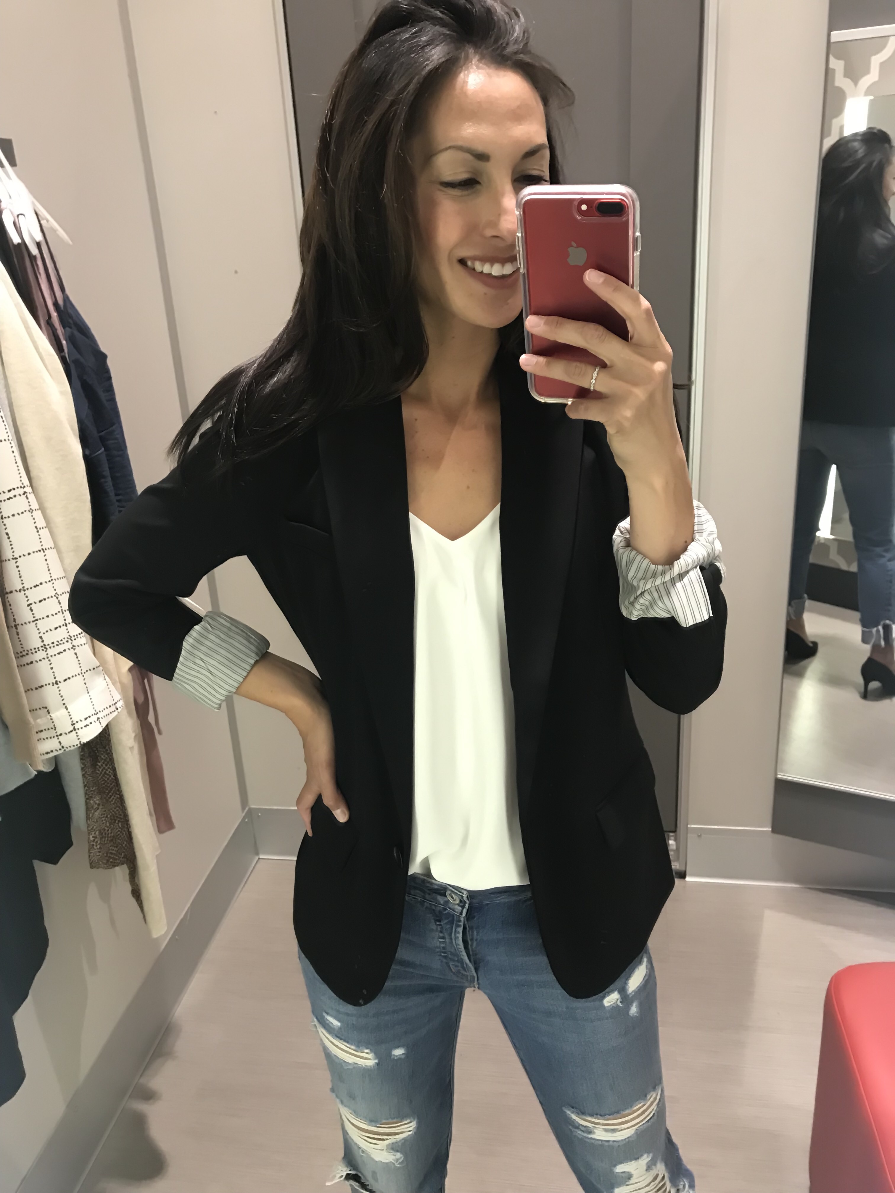So, I couldn’t resist… this blazer is so good that I just had to show you how to dress it down as well. I love that it has a striped lining. Rolling up the sleeves gives it a fun new look! As much as I love a good fitted pant, I am really loving that wide-leg pants are back in style. These wide-leg pant have a tie waist and are only $28. They are long, so depending on your height, you would possibly need to wear them with heels. I am 5’6 on a good day and definitely need to wear heels with these pants.Shop the look: