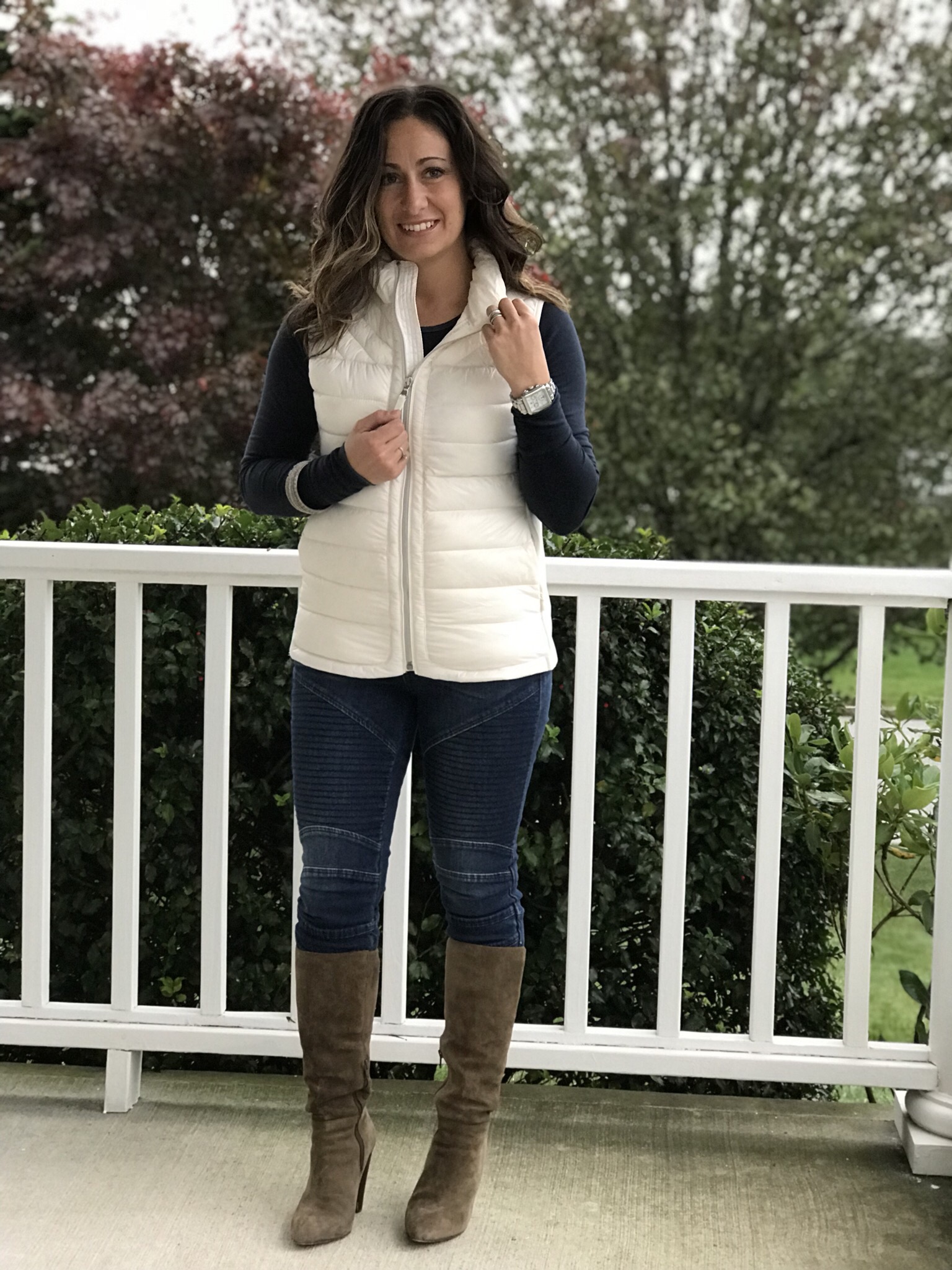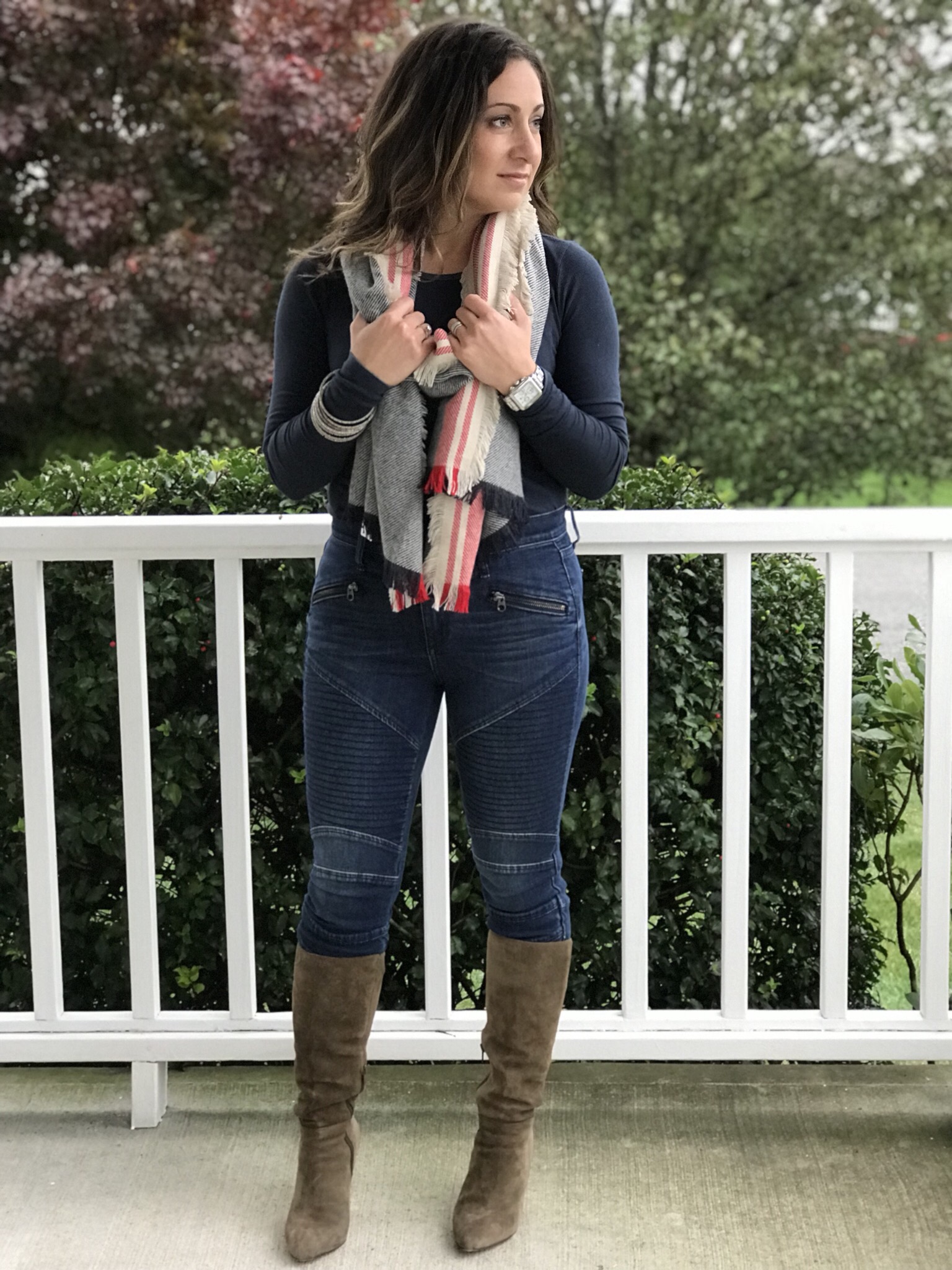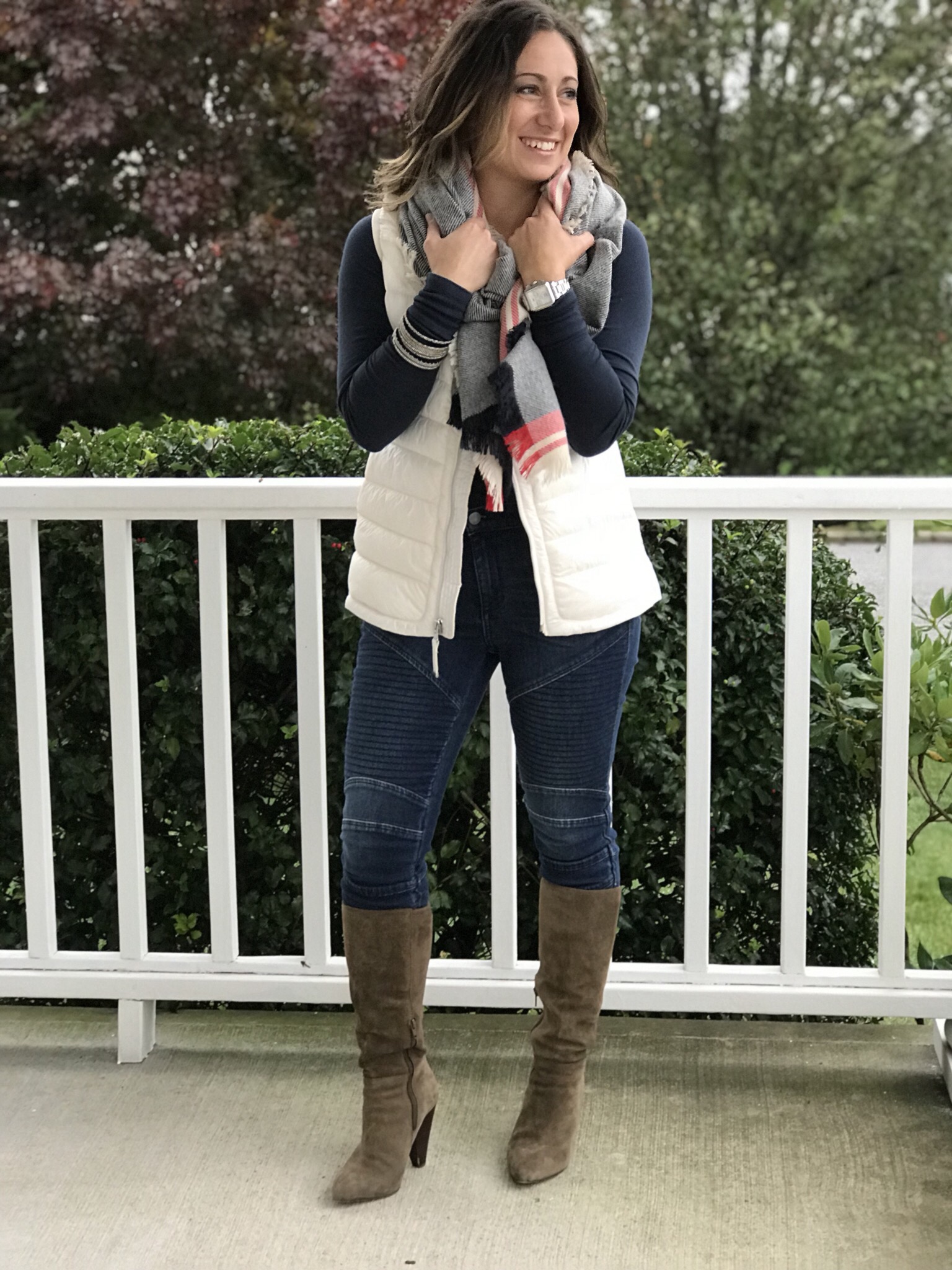 One of my most favorite outfits for the fall include jeans and a cozy puffer vest. These moto jeans are seriously the best I have tried on! They are so super flattering as they are a mid rise and keep everything in place… ya know! This vest is made extremely well and very soft and warm. It comes in several colors too. I will surely be wearing it often! The long sleeve tee is an updated twist on a classic and is so soft that you will not want to take it off. I completed this look with tall boots and a fringe scarf, which also comes in a ton of colors and will complement any outfit.