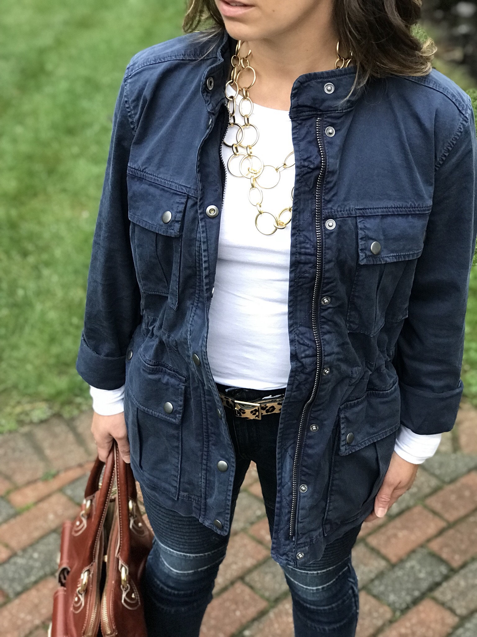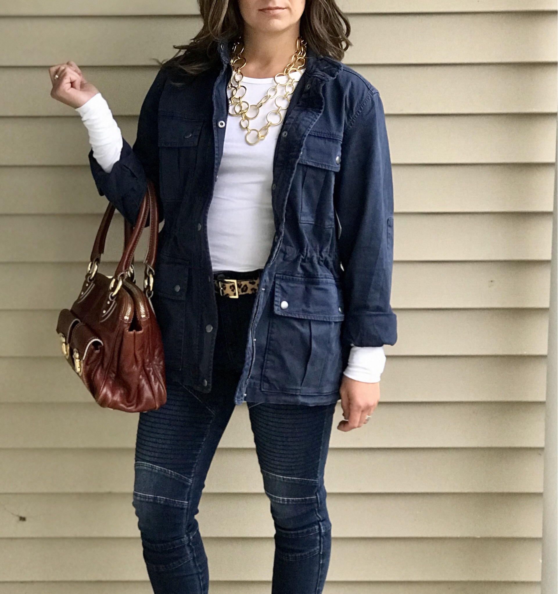 For this next look I paired the moto denim leggings with a basic twill navy jacket and added a pop of leopard. I mean, everyone can use leopard in their life. This adorable belt gives the outfit just enough sass.