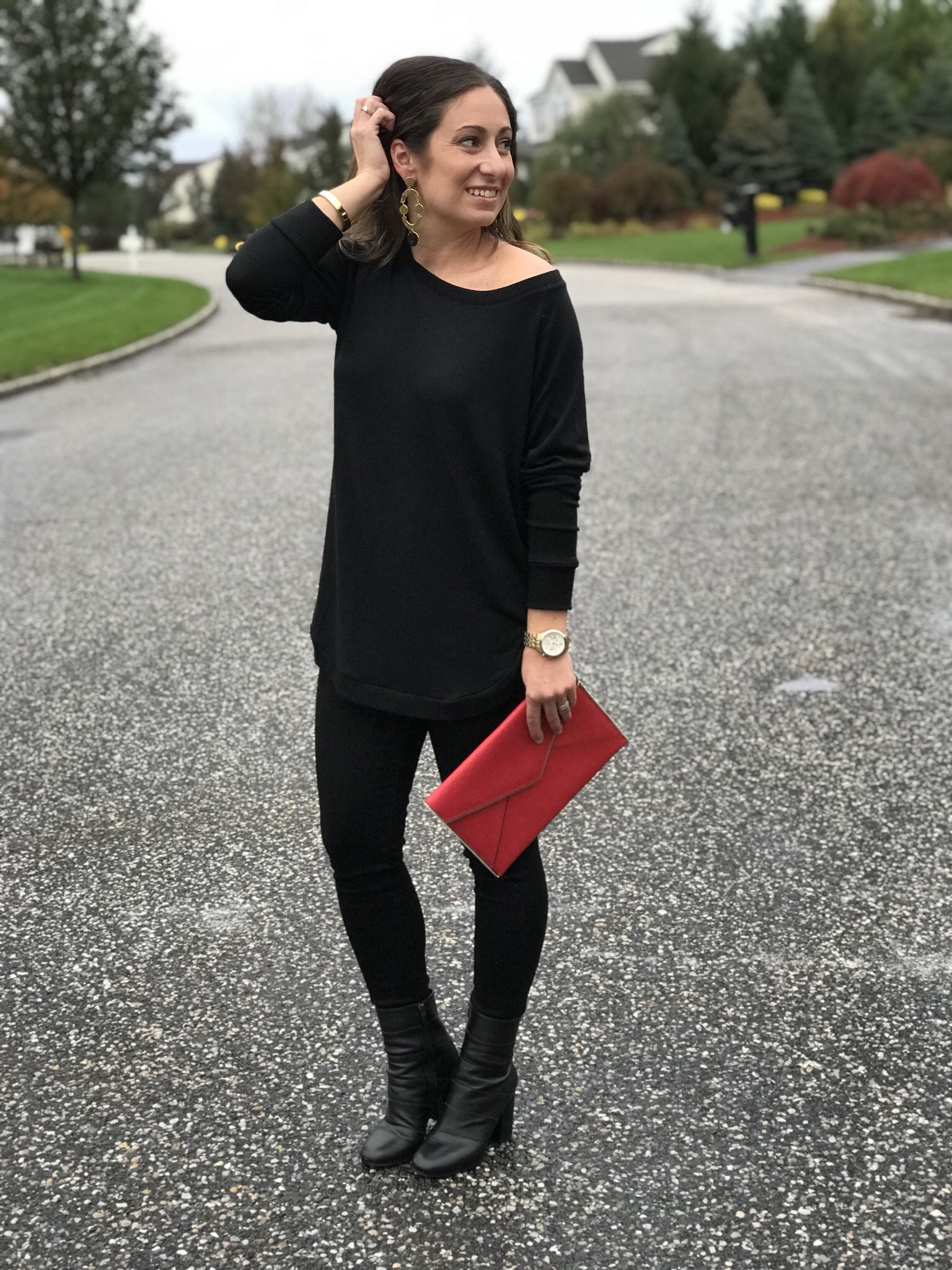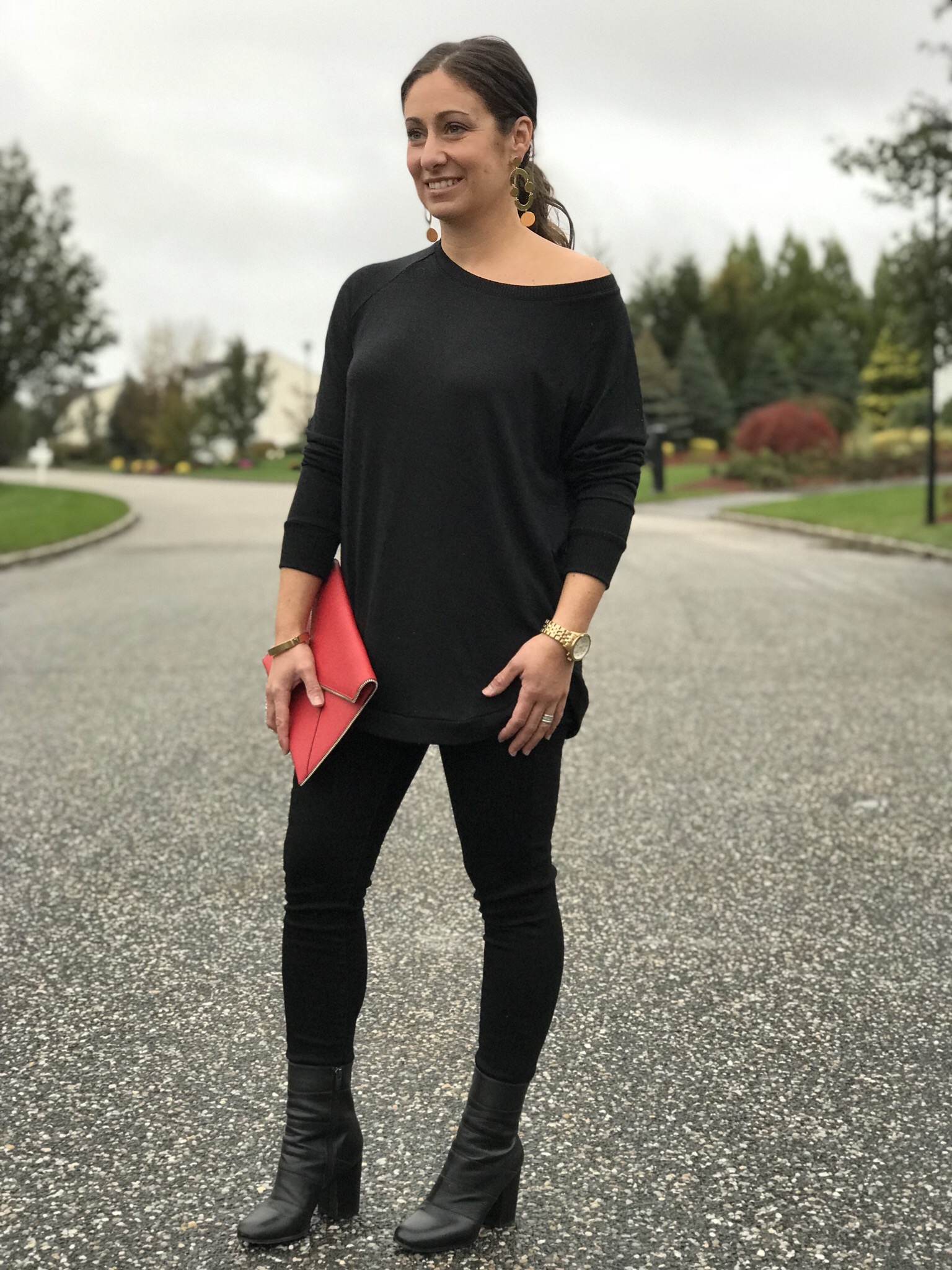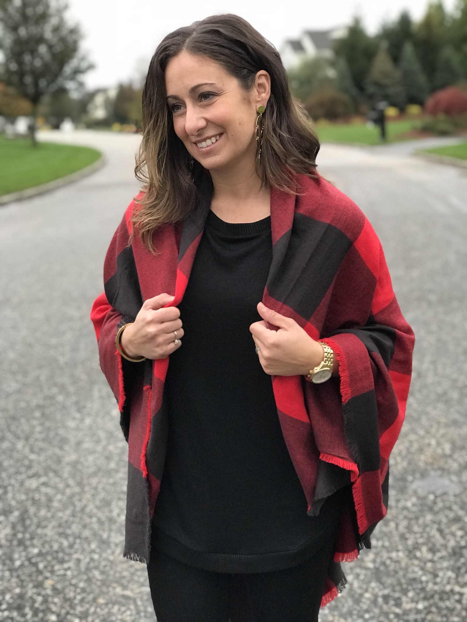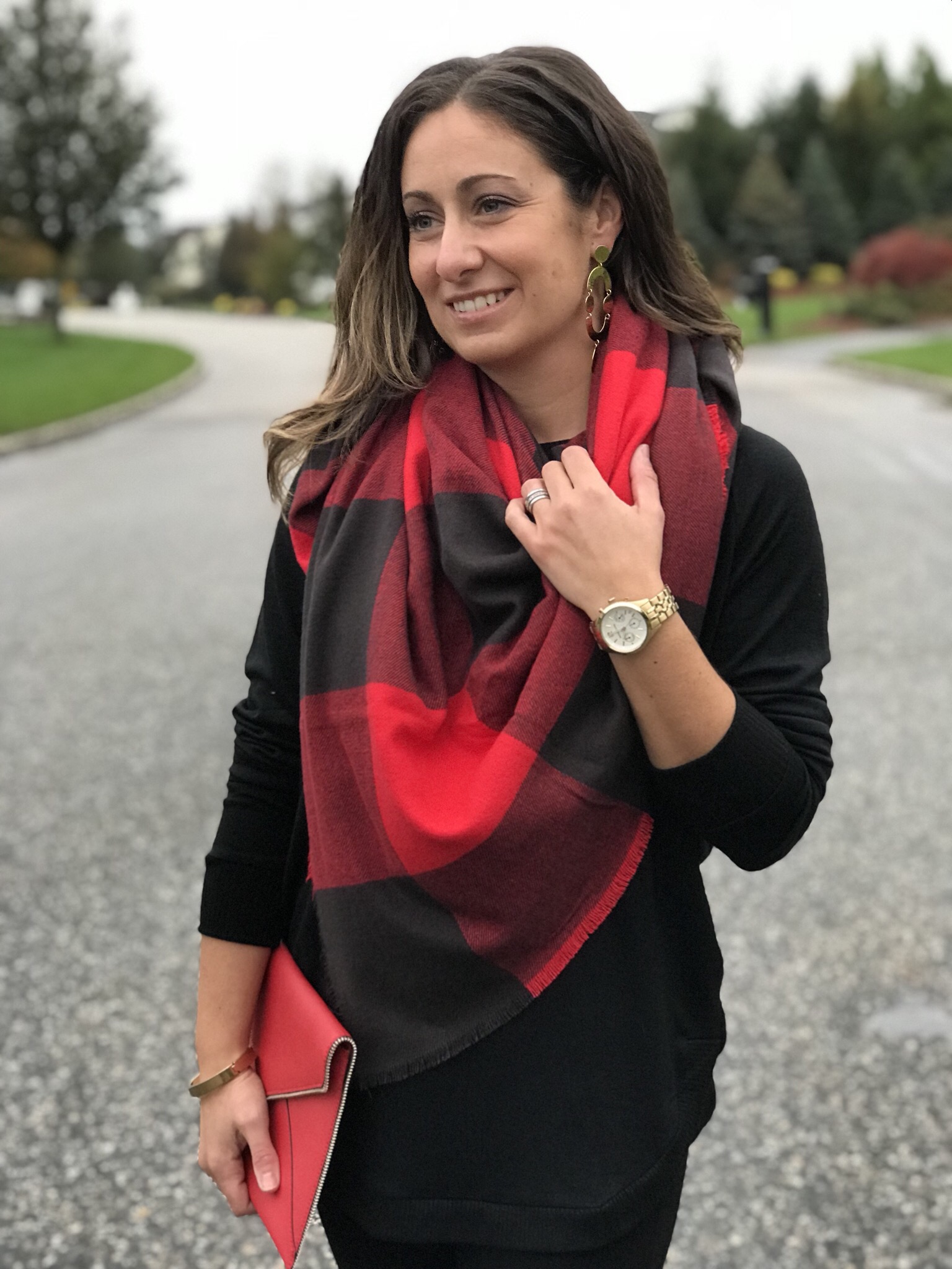 Night out? No problem. Check out these awesome black jeggings and tunic (which you can wear off the shoulder or as a boat neck) for ultimate comfort and style. The tunic is so soft you will want to wear it around the house! I added these fabulous J.Crew gold earrings to complete the look. For a more casual feel I styled with this oversized buffalo check red and black scarf that can be worn as a poncho or traditional scarf. To complete the look, I added black booties and my favorite Rebecca Minkoff clutch.