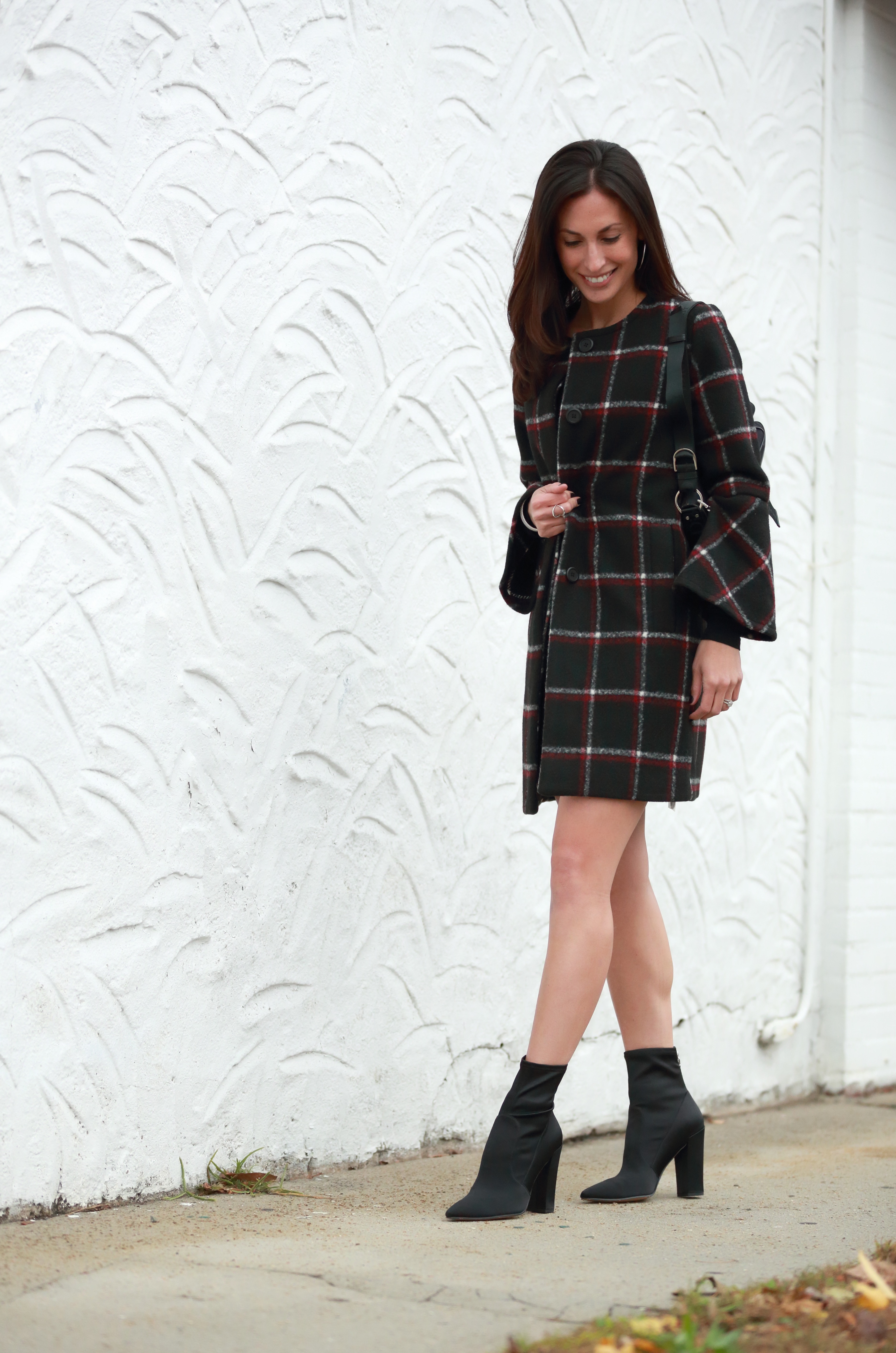 Although plaid is a classic pattern, designers are constantly creating new ways for it to be incorporated into your wardrobe. The plaid pattern now goes well beyond the basic button down or scarf. One thing that we are seeing a lot of recently are plaid coats! The one shown here integrates another fall trend…the bell sleeve. By adding this simple detail, a classic coat is now ultra feminine and on trend. Here we have styled this coat two different ways to show you its versatility. Once again, however, we have taken a basic black outfit and jazzed it up with a beautiful plaid coat. We’ve linked several options of plaid coats at different price points for you at the end of this post.