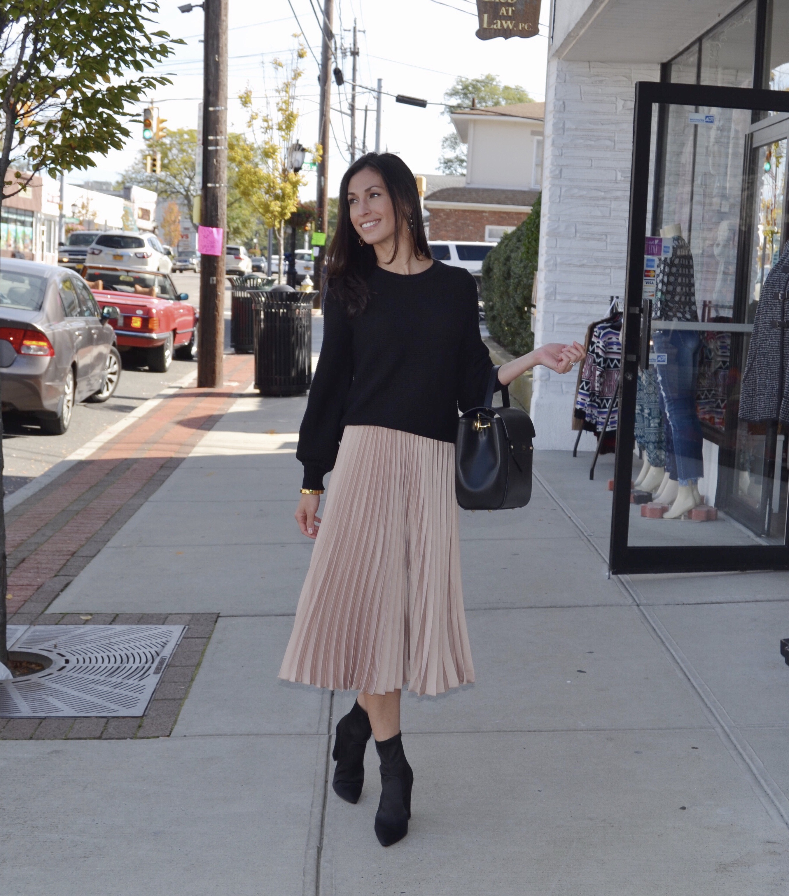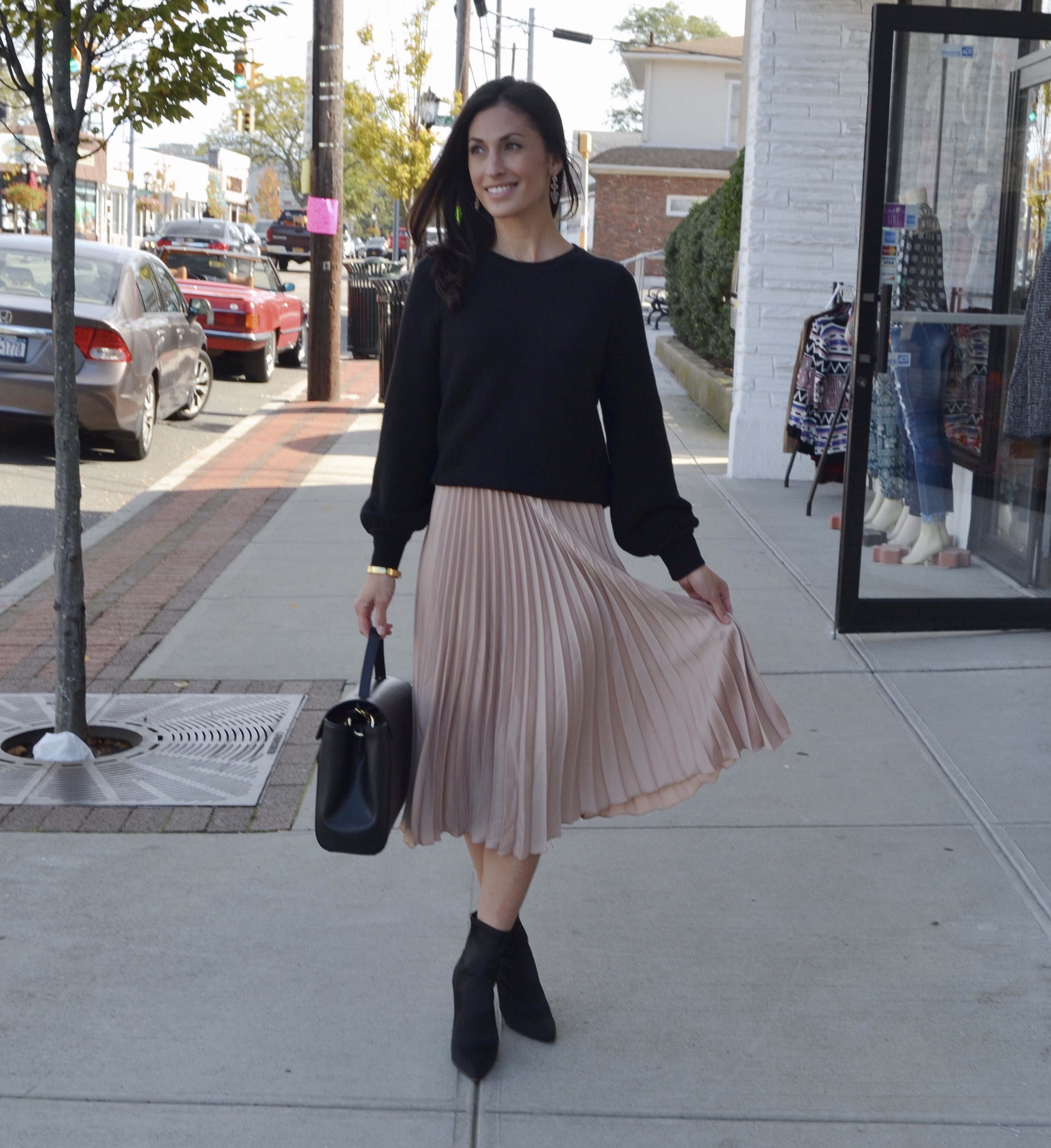 Who loves a good chunky sweater? Well, we do. This look is effortless, comfortable and chic. The sleeves on this sweater have the best detail because they actually balloon at the wrist! Lauren styled with basic but fabulous pieces, such as a beautiful Camelia Roma bag and black satin booties.