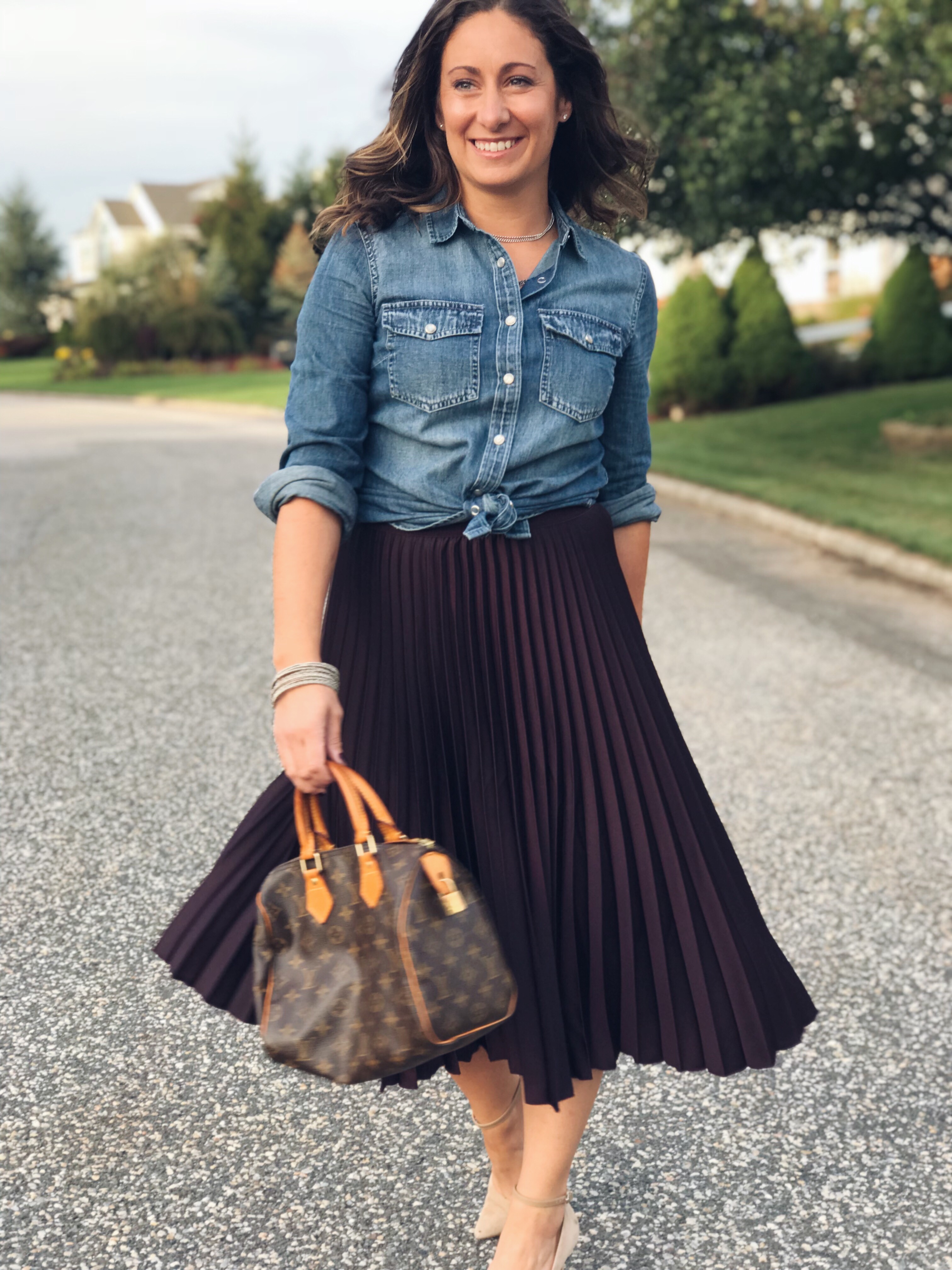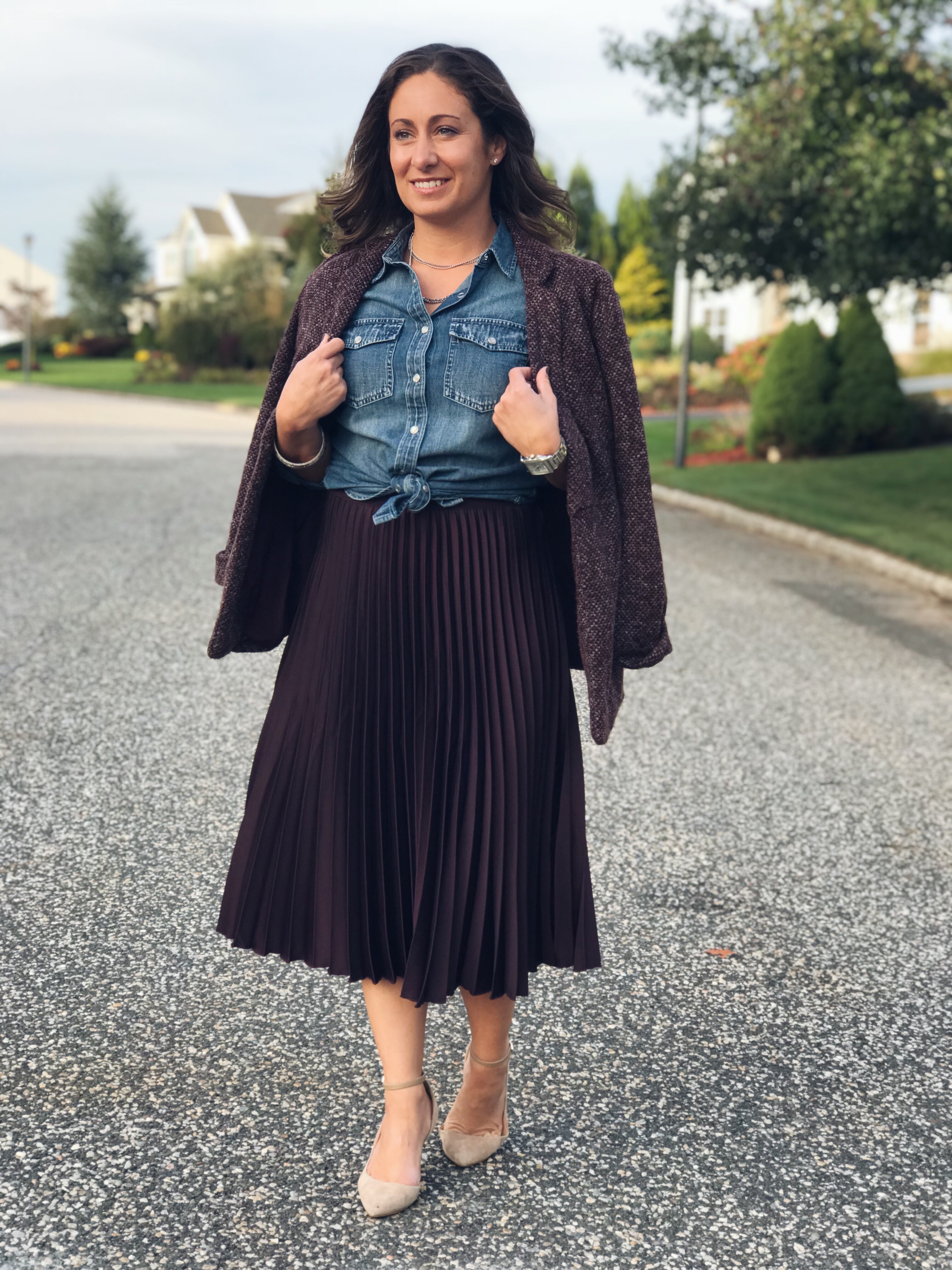 This first look brings in our love of denim. Denim just adds a crisp look to any outfit and a pleated skirt is no different. It gives the skirt a little bit of a casual look, perfect for work or play. I paired with low key accessories and my basic nude strap heels. For chillier evenings throw on a sweater blazer and you are all set! There’s the twirl again – lol
