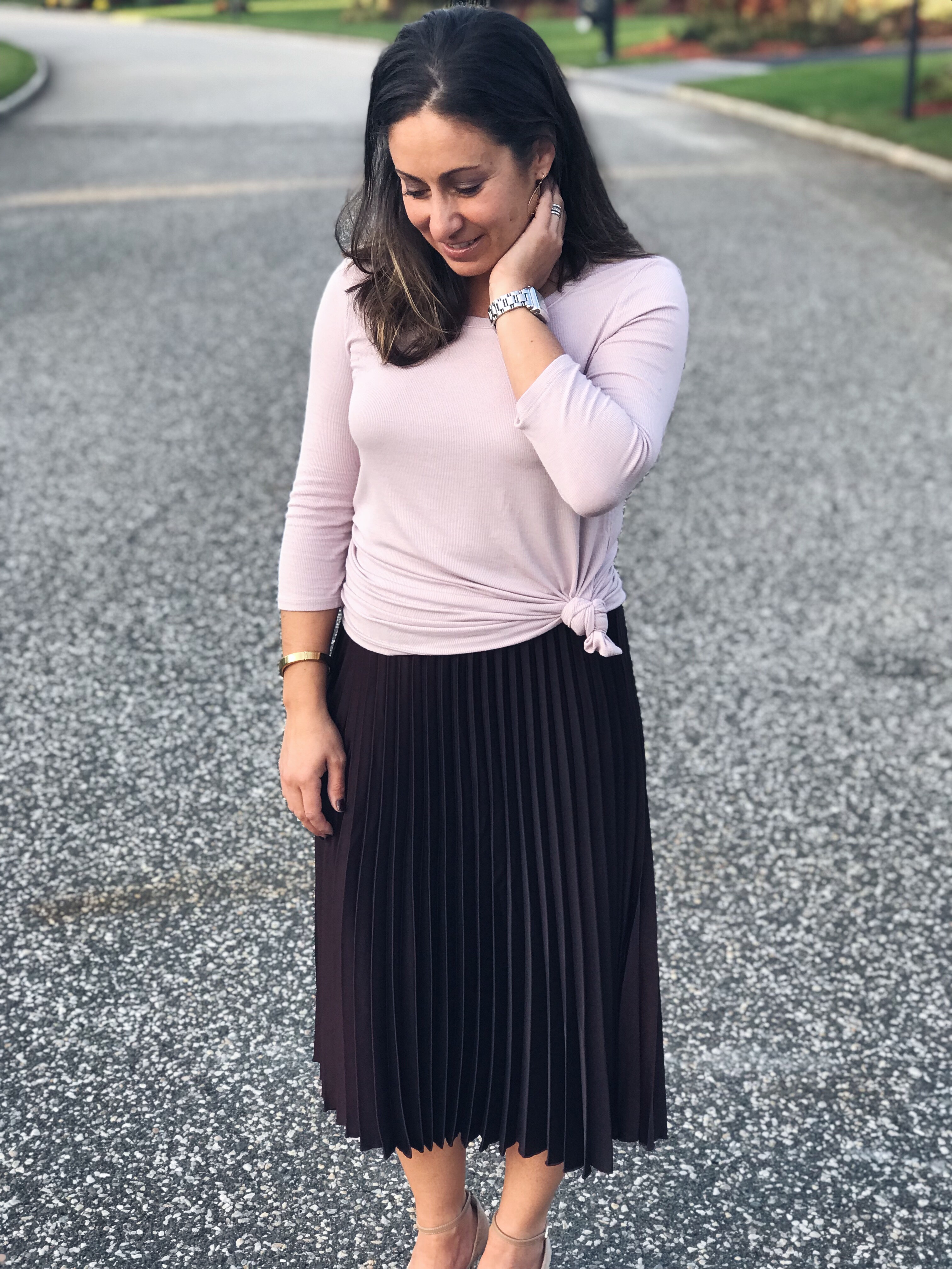 Another way to achieve an updated look with this pleated midi skirt would be a simple knotted tee. No need to get fancy here – lol. We are all about comfort and style. Working moms continuously on the go require outfits that are easy and quick, but still stylish and fun! Knotting, whether the denim above or the tee below, flatters the waistline. It’s a comfortable way of showing off those beautiful curves ladies! Also, I added a denim jacket with this outfit to give it that cool mom feel 😉 I’m not cool, quite dorky actually!
