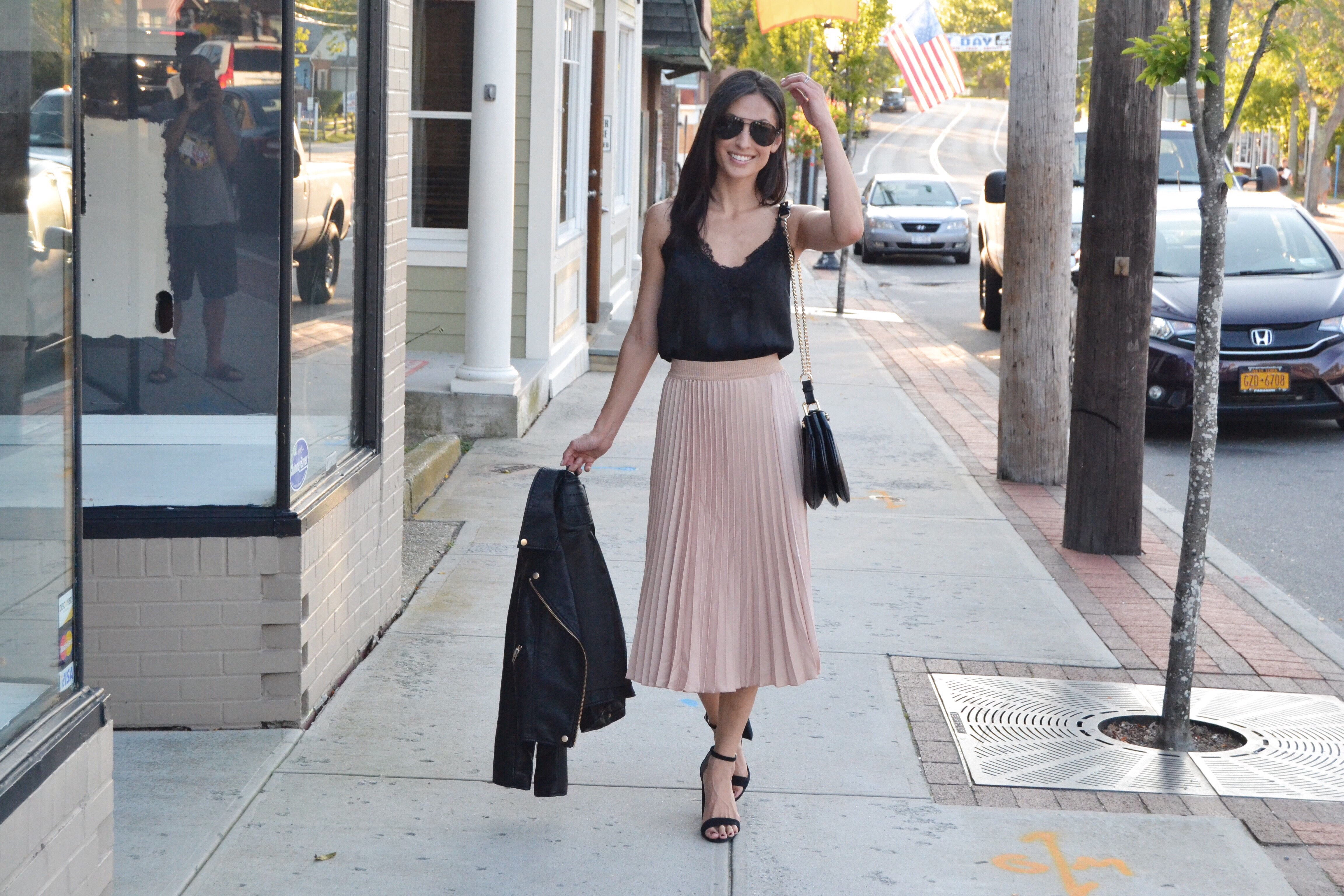 Here comes the edge! Lauren rocked this look giving this classic and timeless skirt a push towards way cool mom. This is perfect for a night out on the town or just dinner with the gals. Lauren added our favorite summer heel – let’s face it, it’s still hot in the NY, so we can still get away wearing them. To complete the look she added a lace cami, a super cute bag, and of course, a fall staple – a moto jacket.