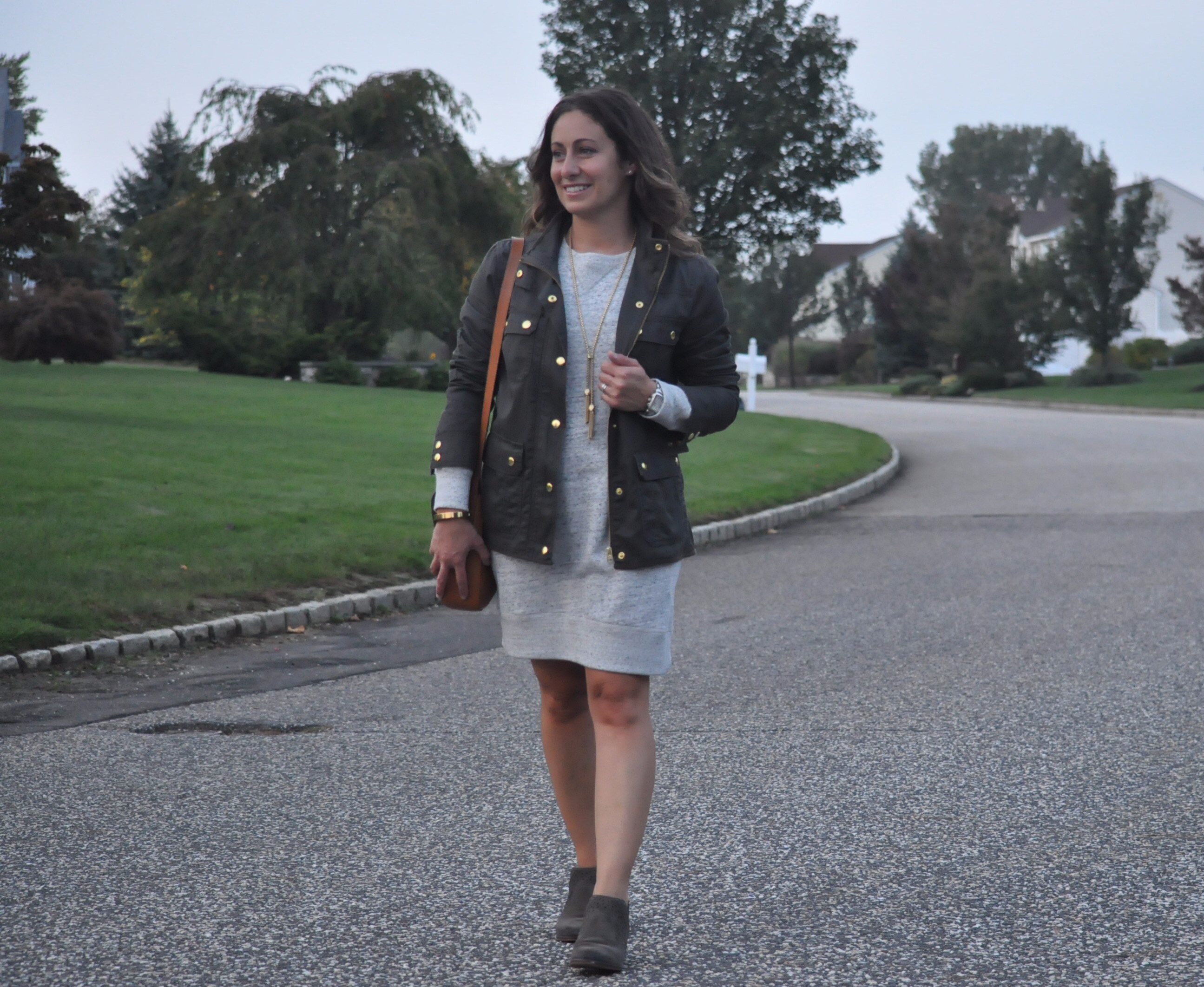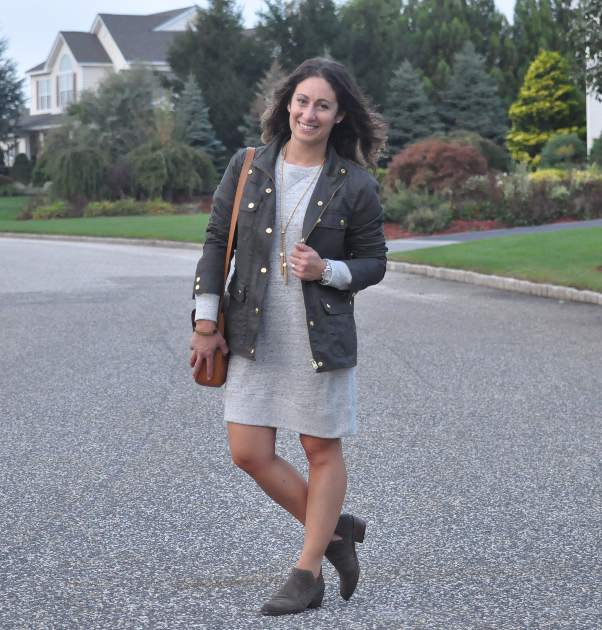 I decided to throw on my J.Crew field jacket, Vince Camuto booties and a crossbody bag for this look. Also, kept the outfit simple with a few gold accents – J.Crew tassel and hinge bracelet. I really love this jacket and it gives the sweatshirt dress an updated, but yet very casual feel.