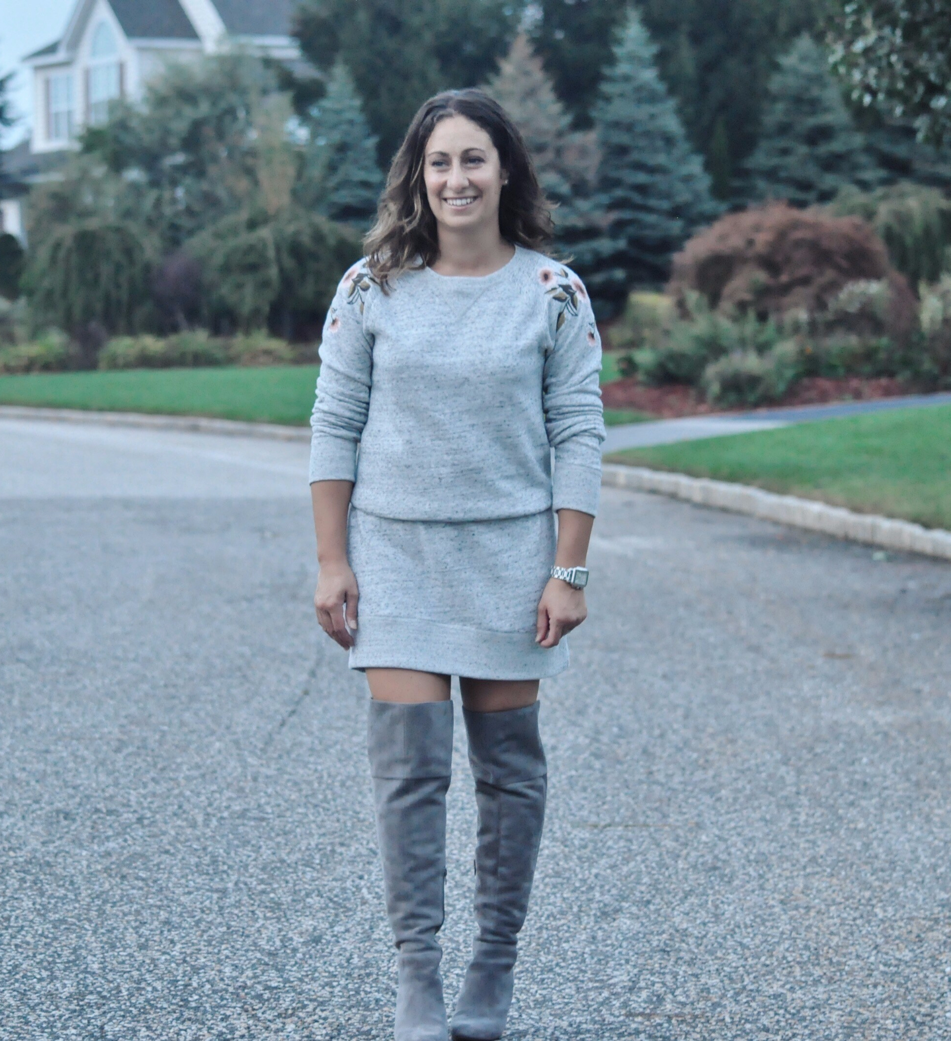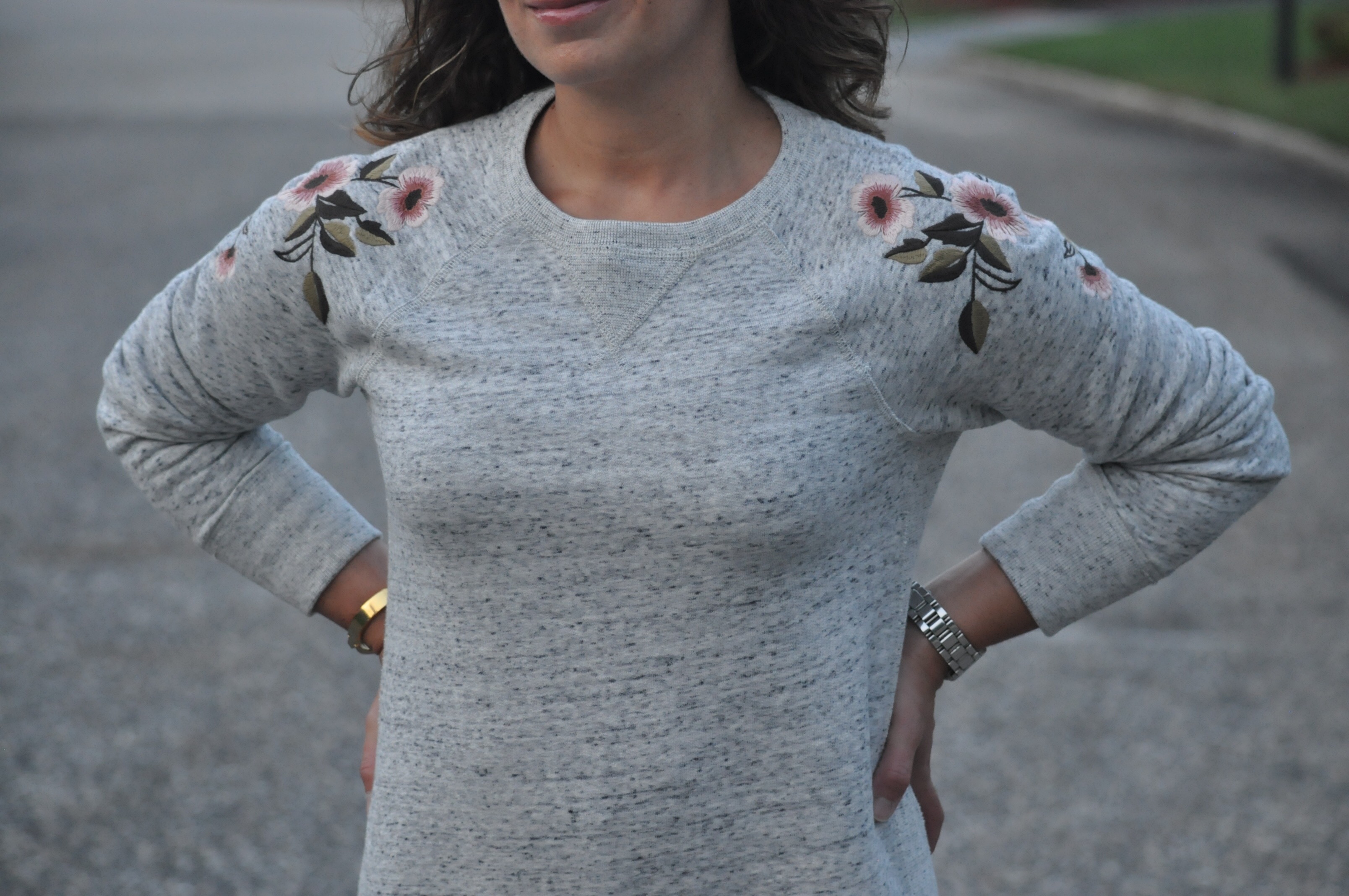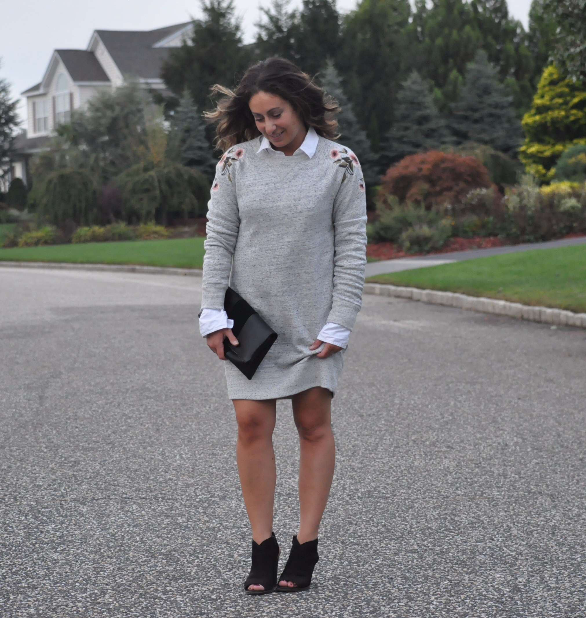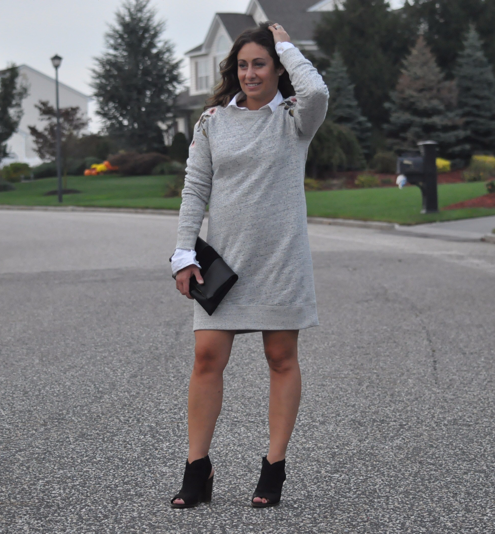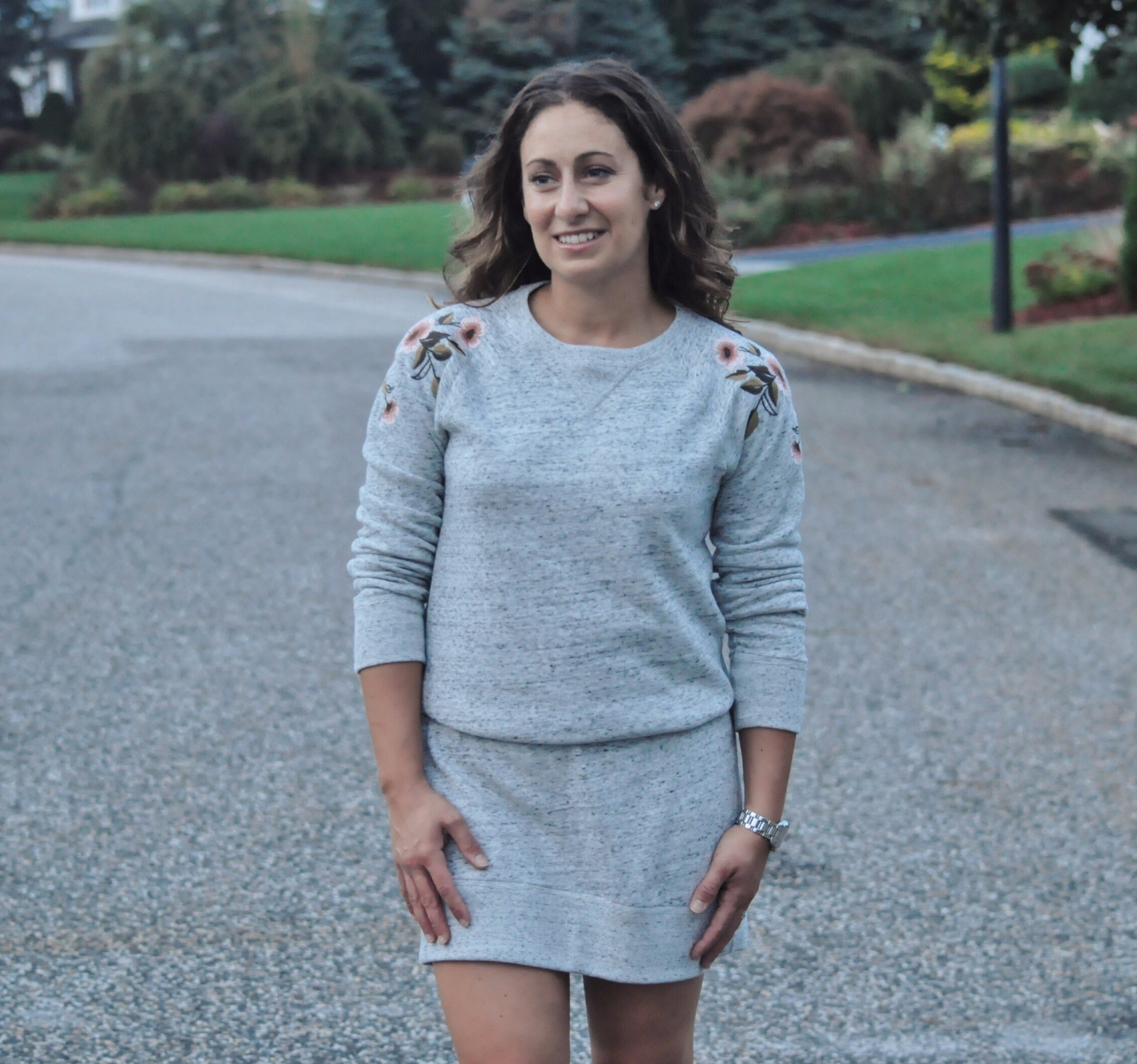 After thinking about my next focus for this blog, I wanted to feature an item that can be styled in several different ways. This particular sweatshirt dress is from Abercrombie & Fitch and it is super cute!! It has the most adorable floral embroidery on the shoulders and the fit, although a little looser, is flattering. Keep scrolling to view the different ways to wear this and any other sweater dress.