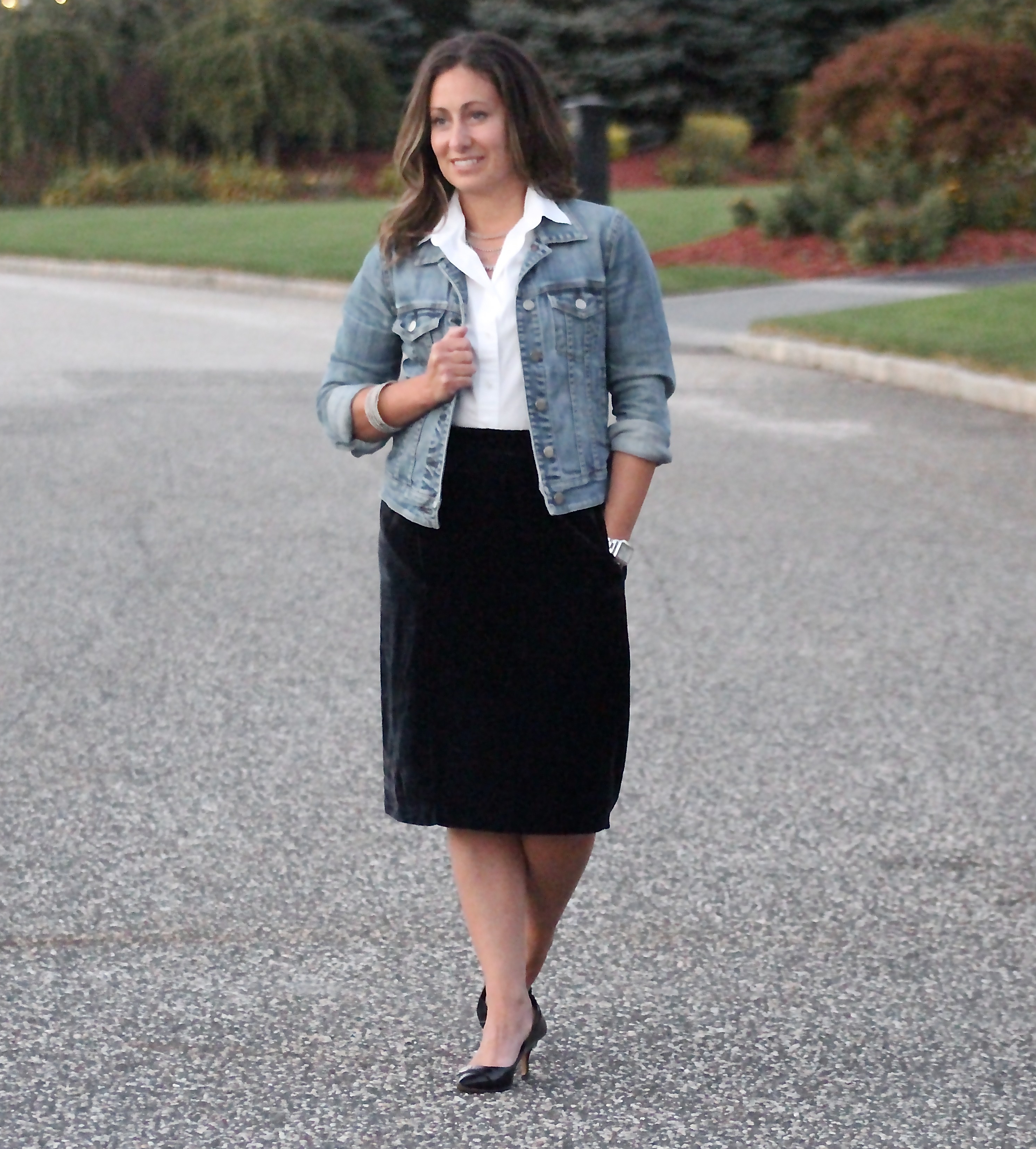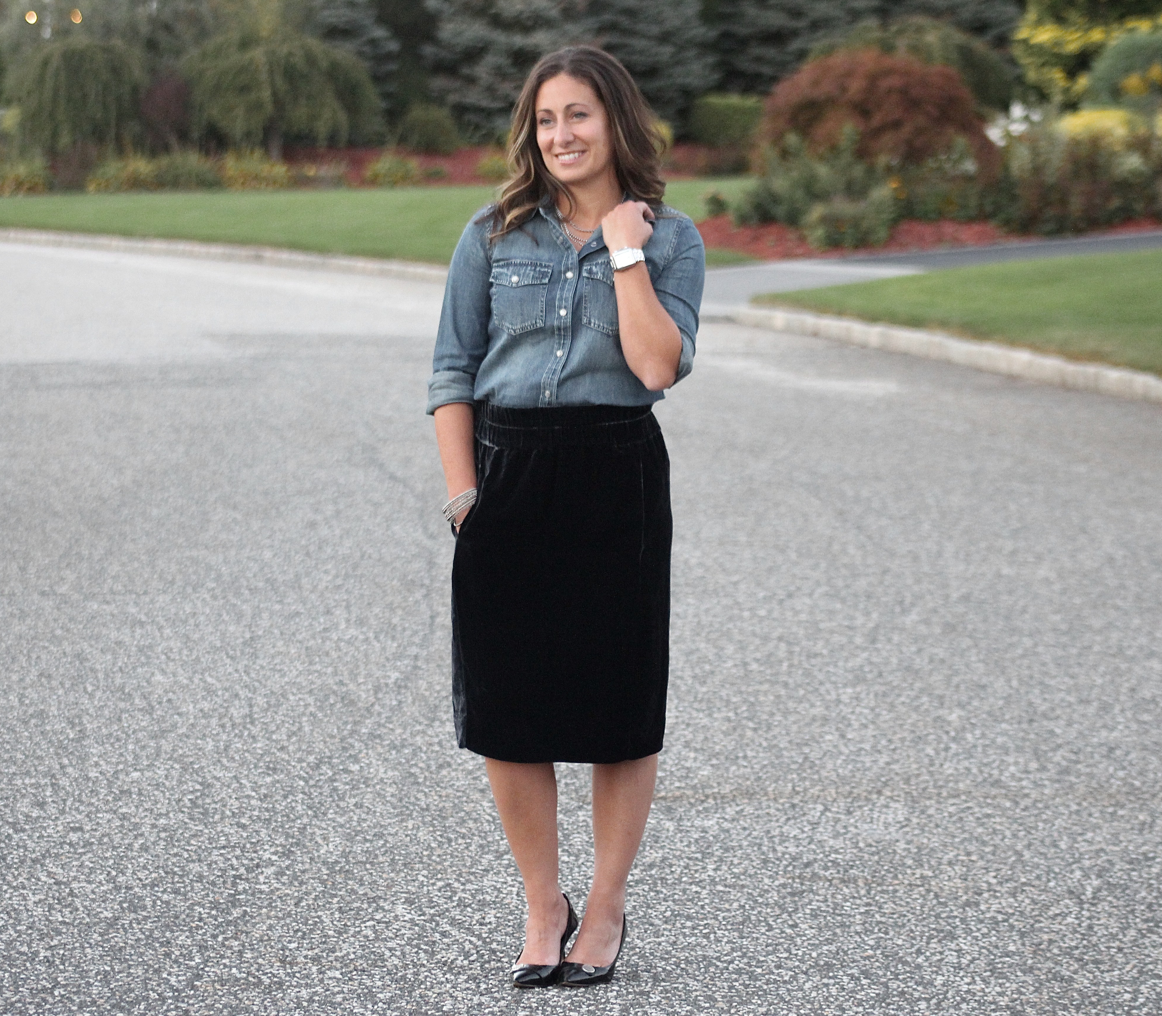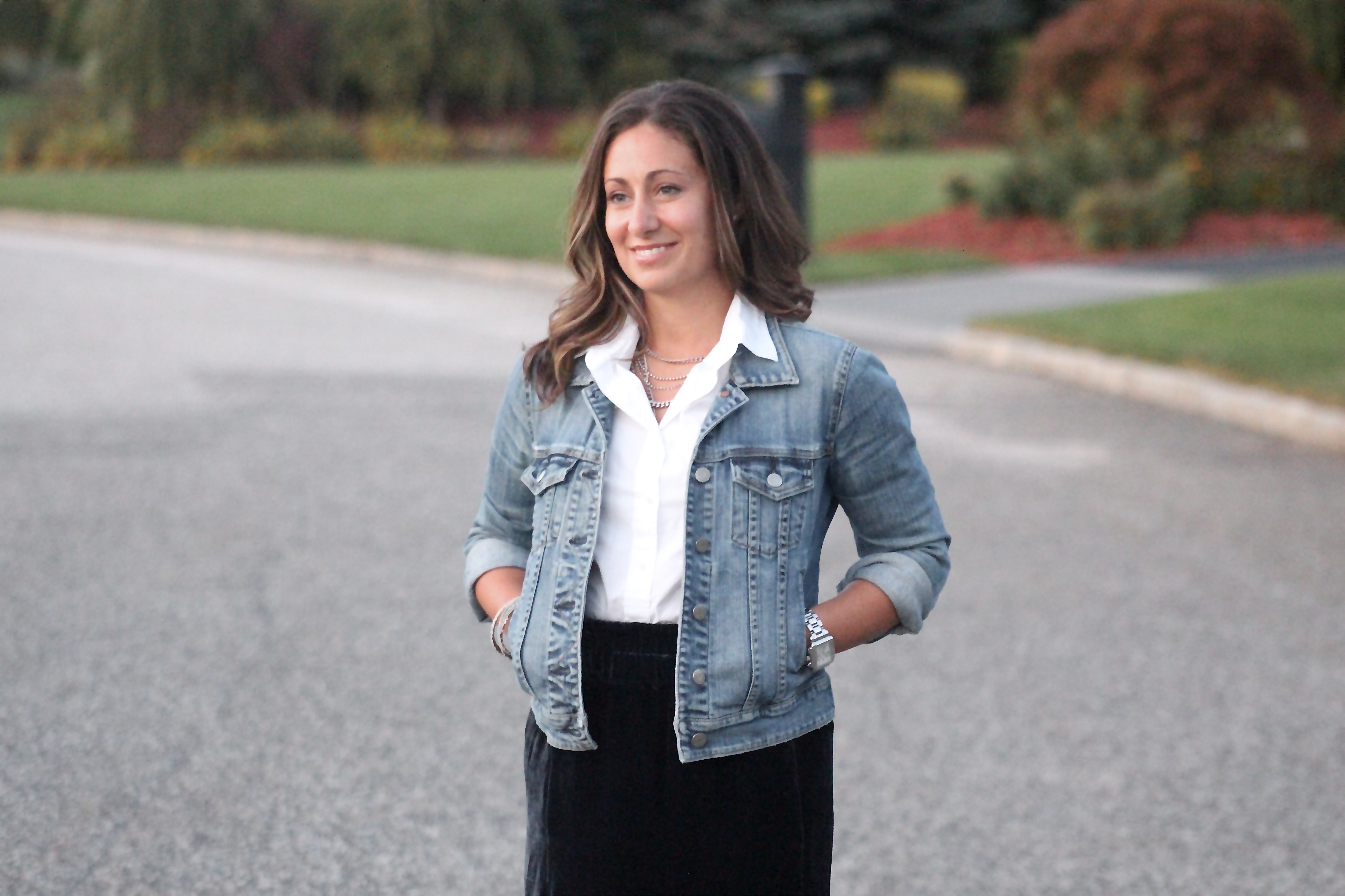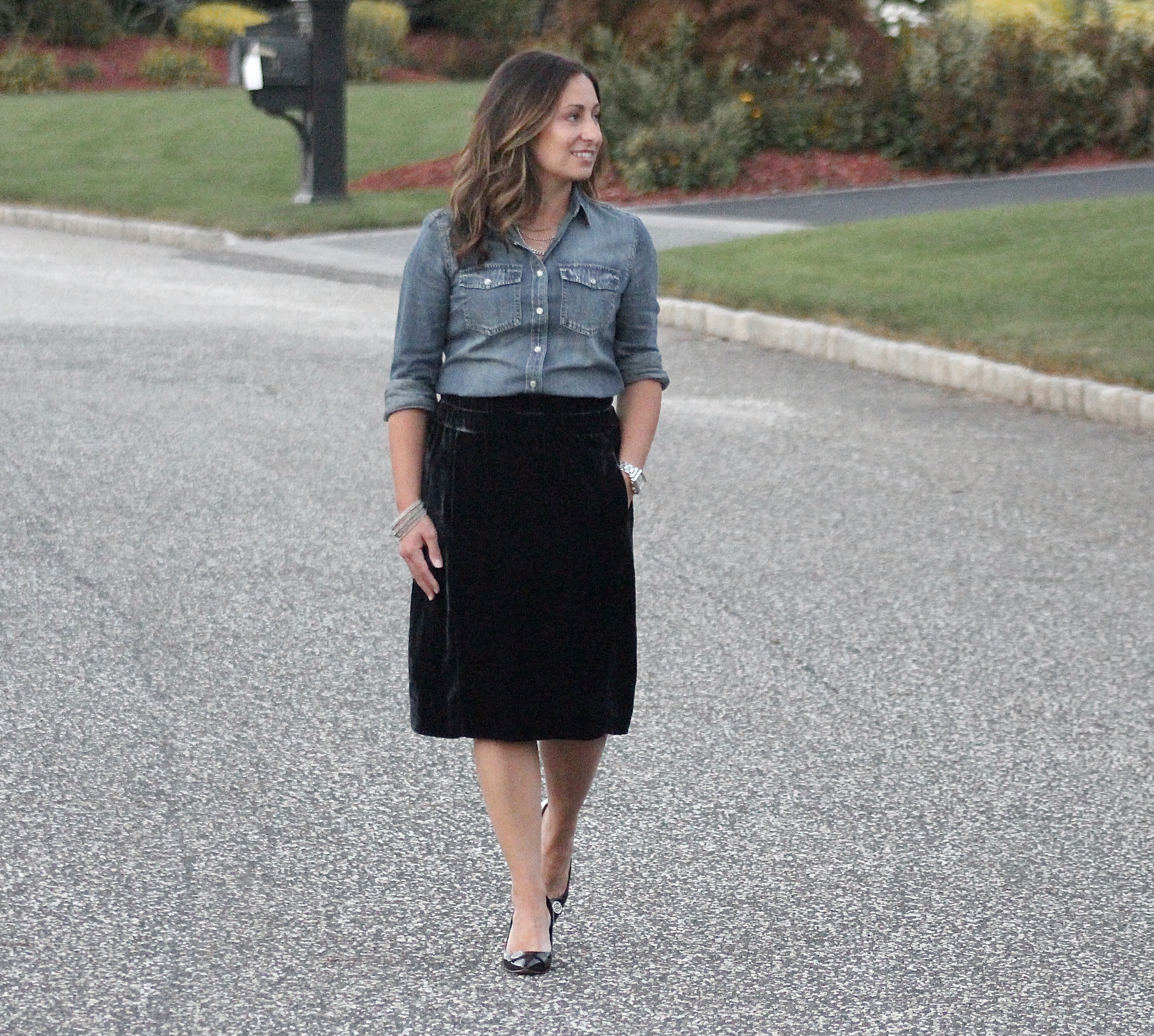 The velvet crush continues. I am going to be honest for a minute… So I walked out of my house and was getting ready to shoot this outfit and my husband says to me, “Are you sure about this outfit?” LOL – I said, ah YES! I thought for a second to go back and change, but if you really enjoy an outfit – own it! I truly believe that if you are comfortable and confident with your outfits, it doesn’t matter. I am loving mixing textures these days and really enjoy the velvet and denim combination. Fashion fades, style lasts. My nonna kept repeating that one to me 😉 I have been wearing velvet for a very long time. Sometimes it’s “in” and sometimes it’s “out.” For me, it’s the type of fabric that is timeless. It looks and feels great and is truly flattering whether a skirt, top or shoes! Oh, and not to mention velvet is totally fun.